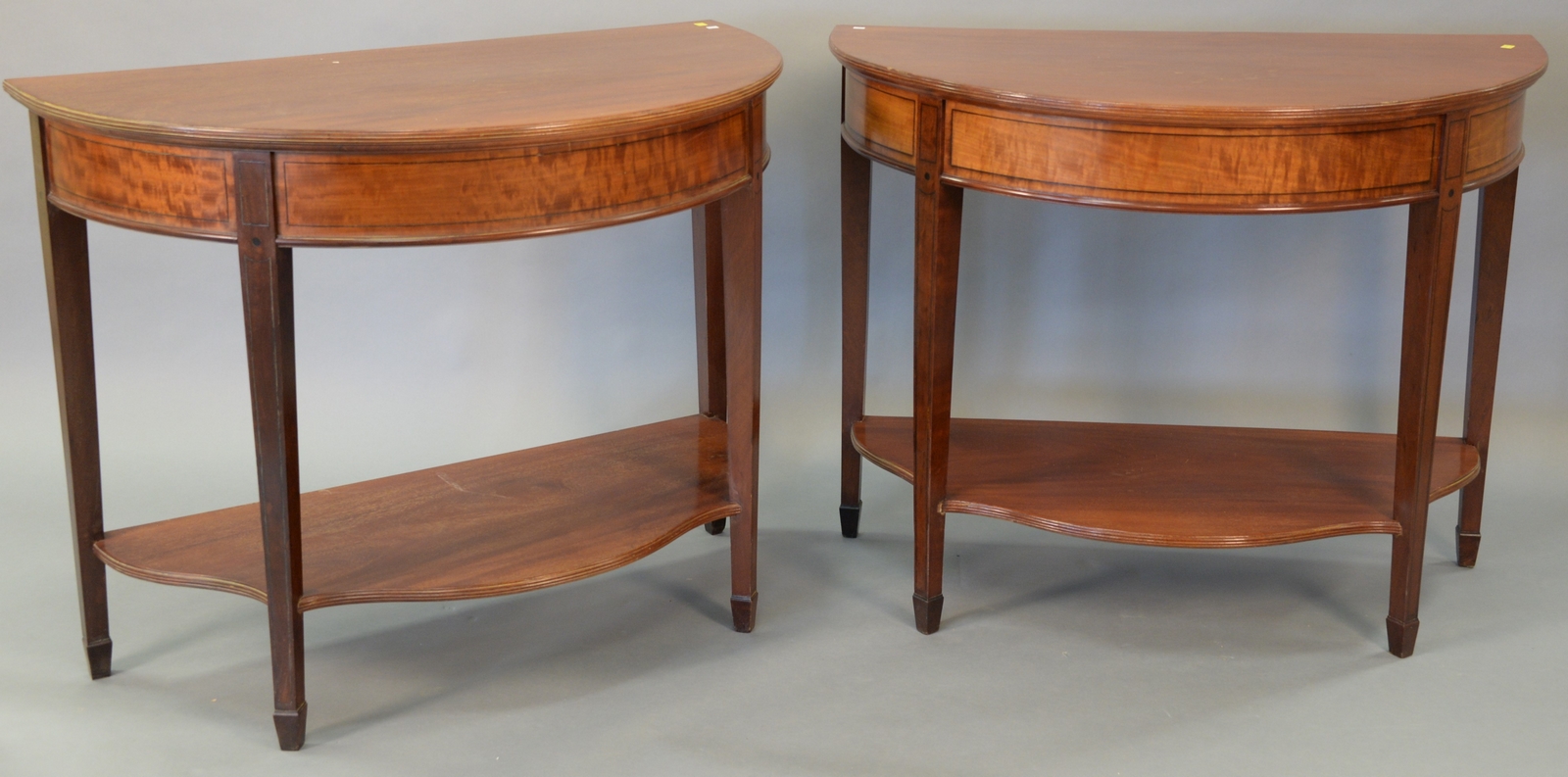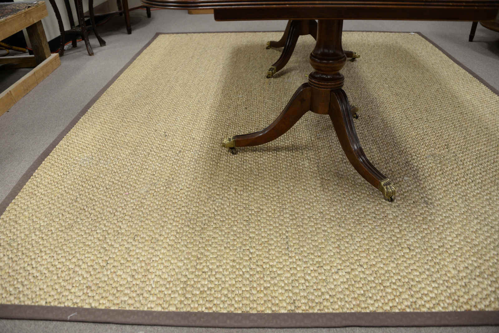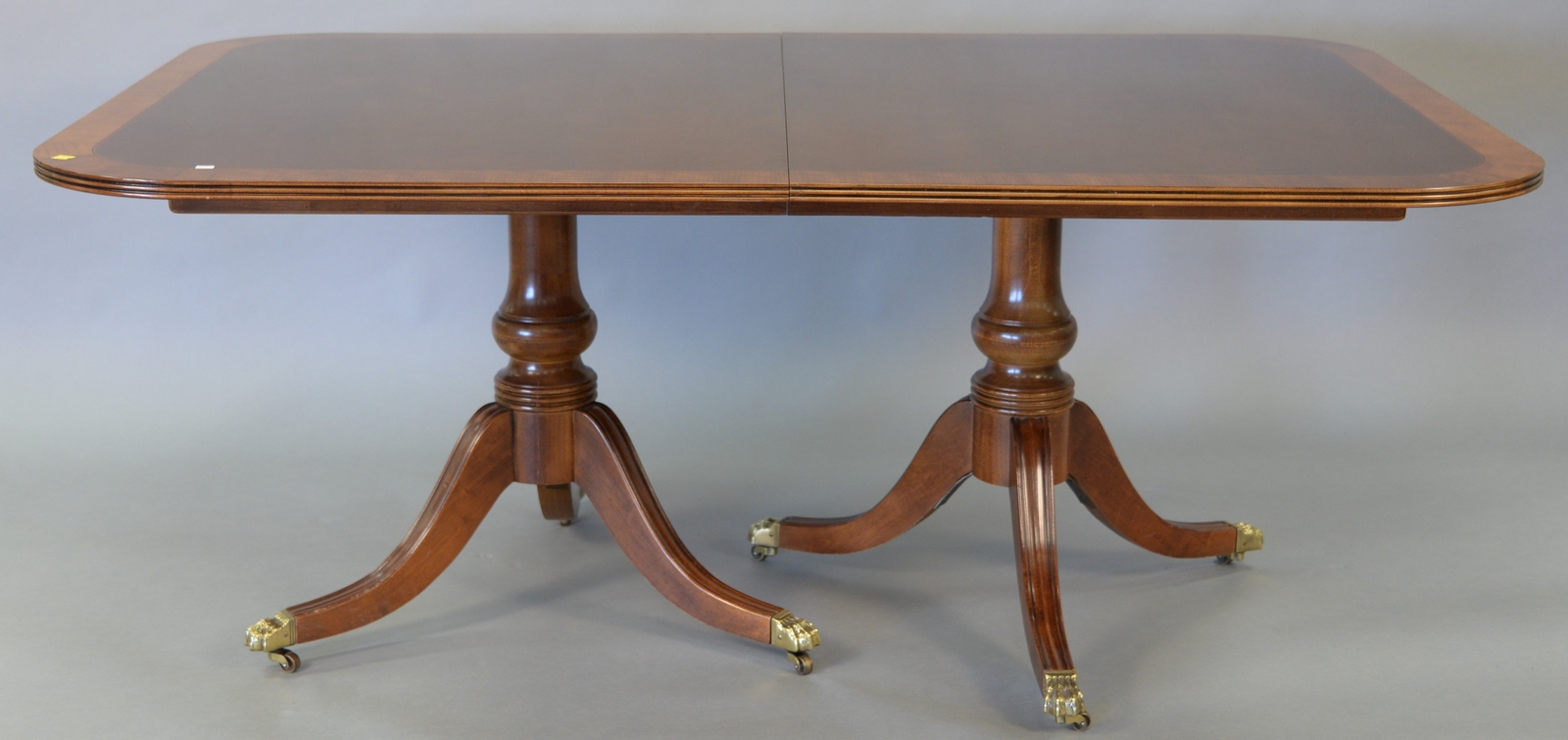 Henredon mahogany dining table with banded inlaid top set on double pedestal base with brass capped paw feet having two 24 leaves. ht. 28 1/2 in., closed 46 x 68, open 46 x 116