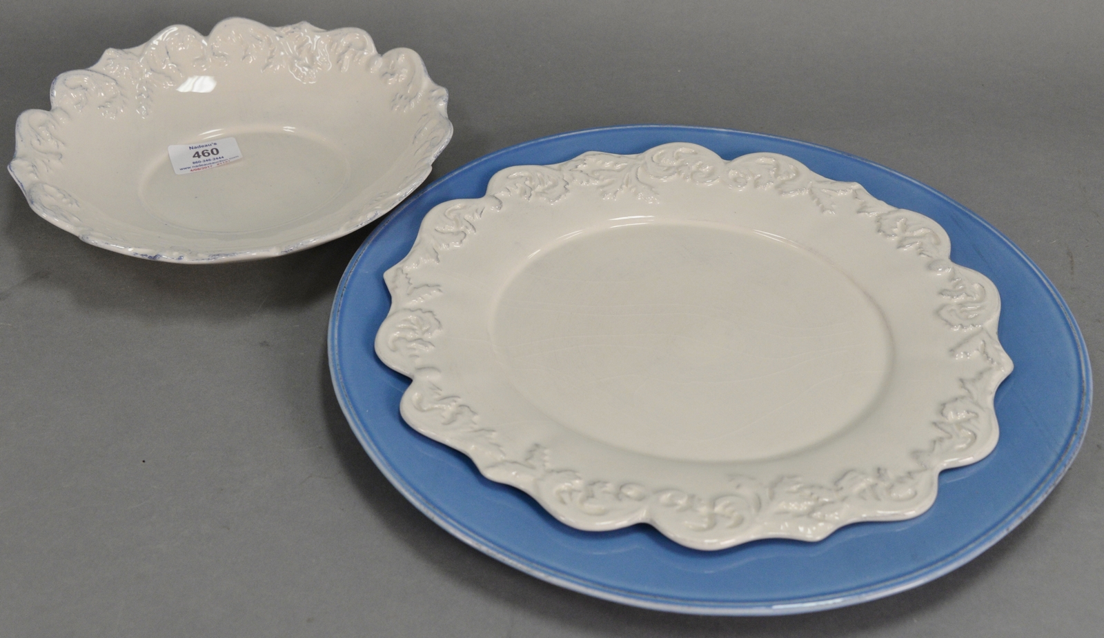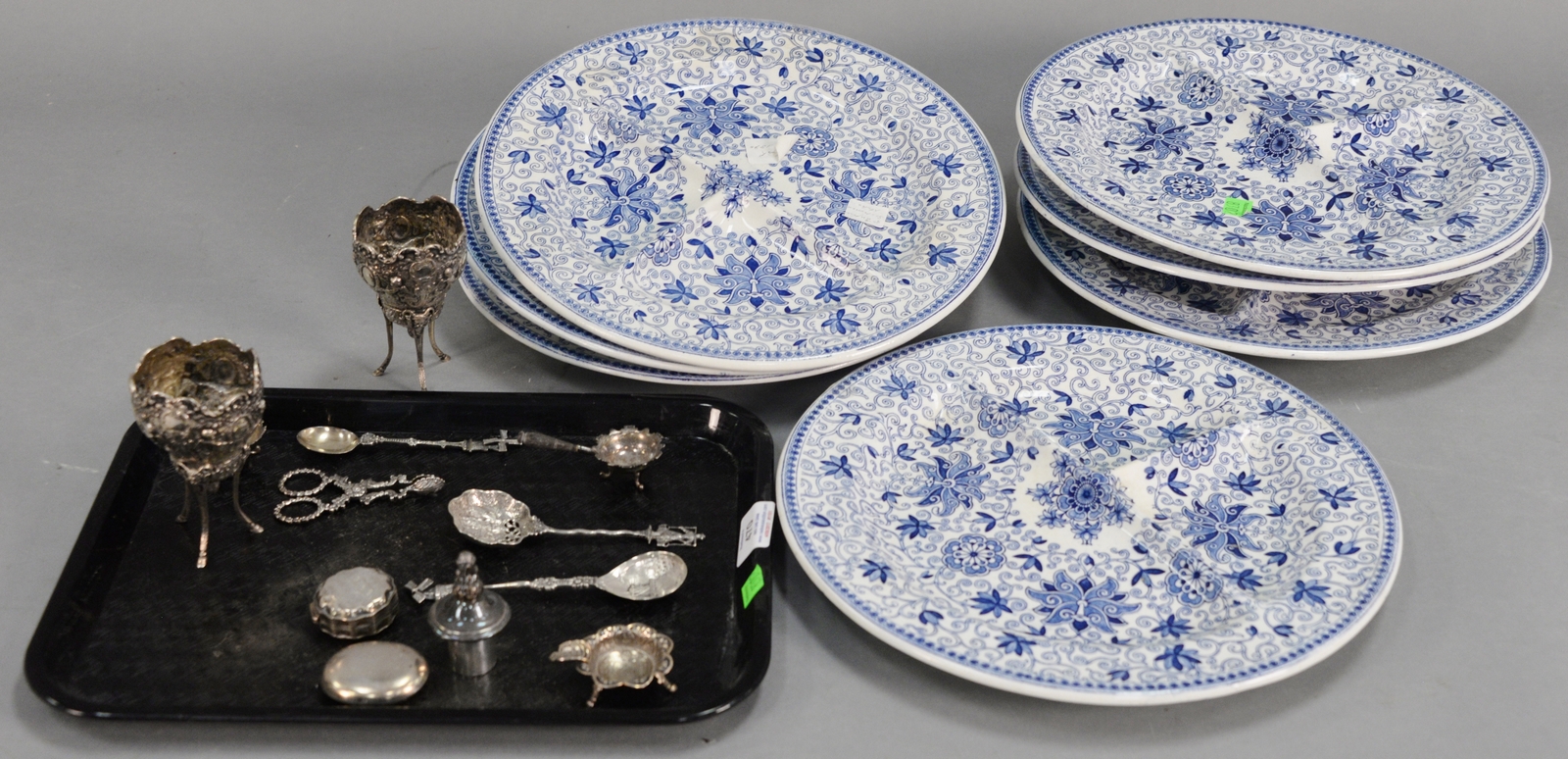 Forty-five Skyros dinnerware set including fifteen ceramic white glazed dinner or luncheon plates with fifteen matching soup bowls, fifteen light blue glazed large dinner plates all marked Skyros hand painted in Portugal by Le Faubourg. 9in. to 14 1/2in.