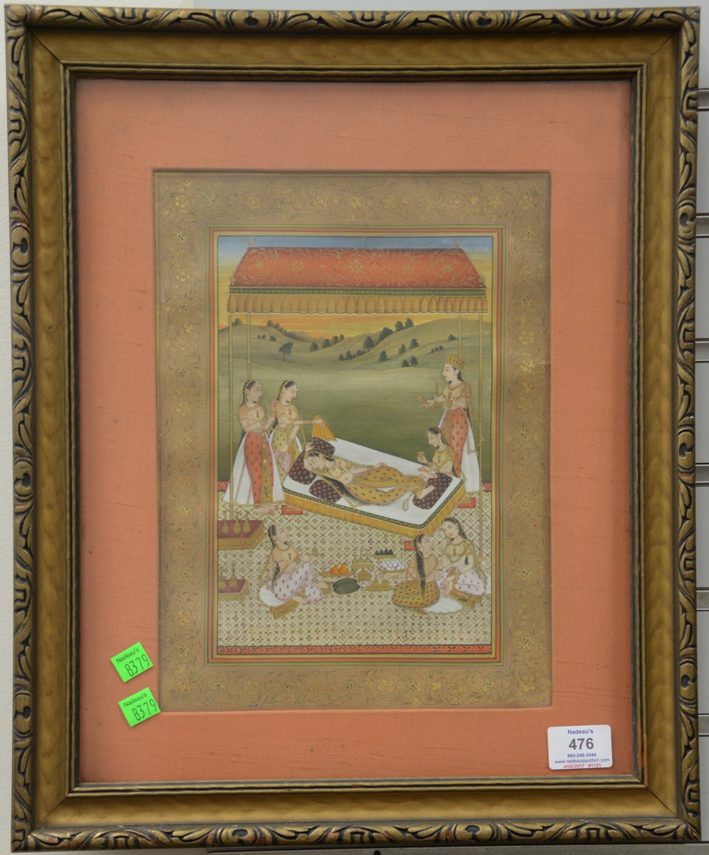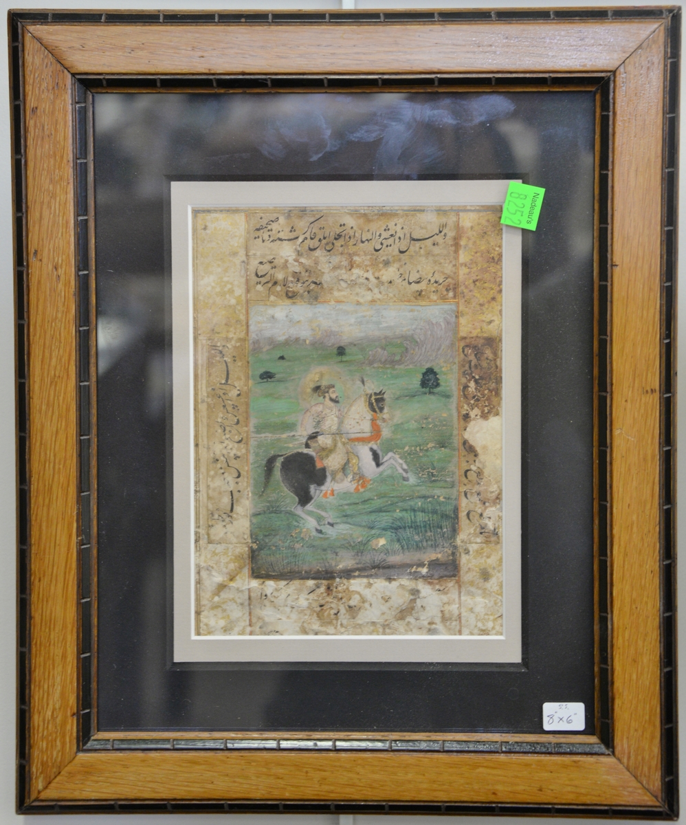 Two Indonesian hand painted gouache including a manuscript page with a man on horseback 7 1/2 x 5 and a seated figure of a bearded man holding a scroll 8 x 6.
