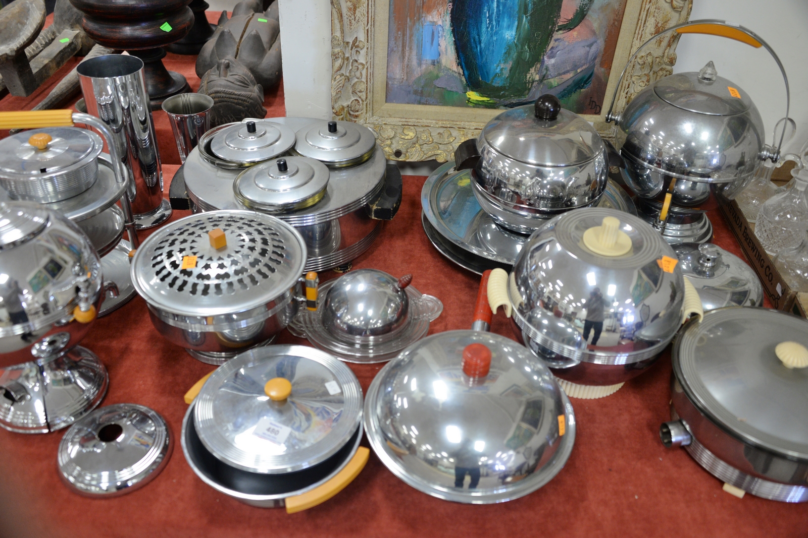 Eighteen piece group of art deco chrome serving pieces including chase chrome pieces chafing dish hot plate condiment steamer etc. hts. 4in. to 15 1/2in.