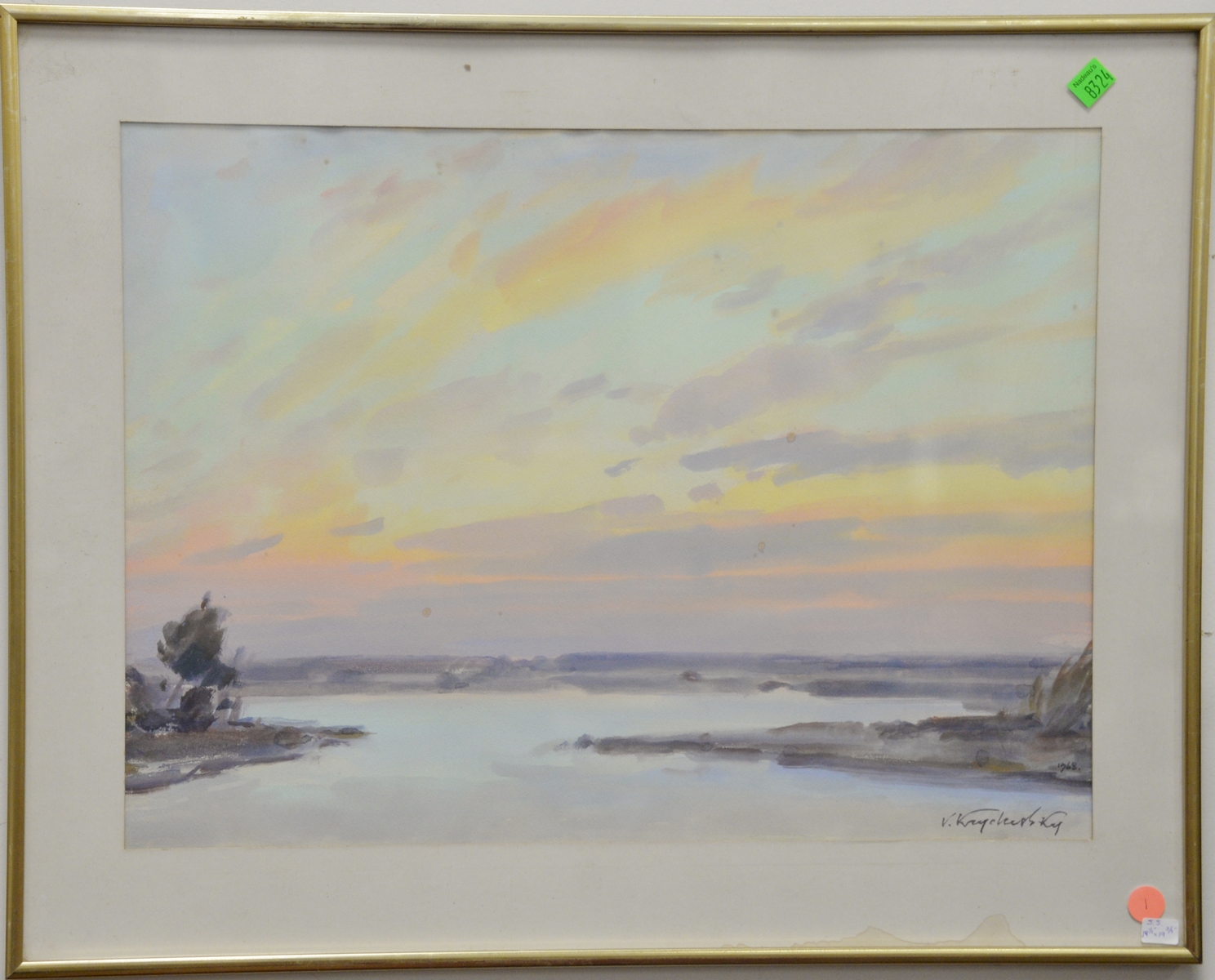 Group of six Russian watercolors and prints to include Mykola Vasyl Krychevsky 1898-1961 canal scene, watercolor of scrolling pine tree, two sunset landscapes signed V. Krychevsky, mountainous landscape watercolor signed lower right Jaroslava Kinal, and print of flowers after Mock. sight sizes 12 x 10 to 15 x 20