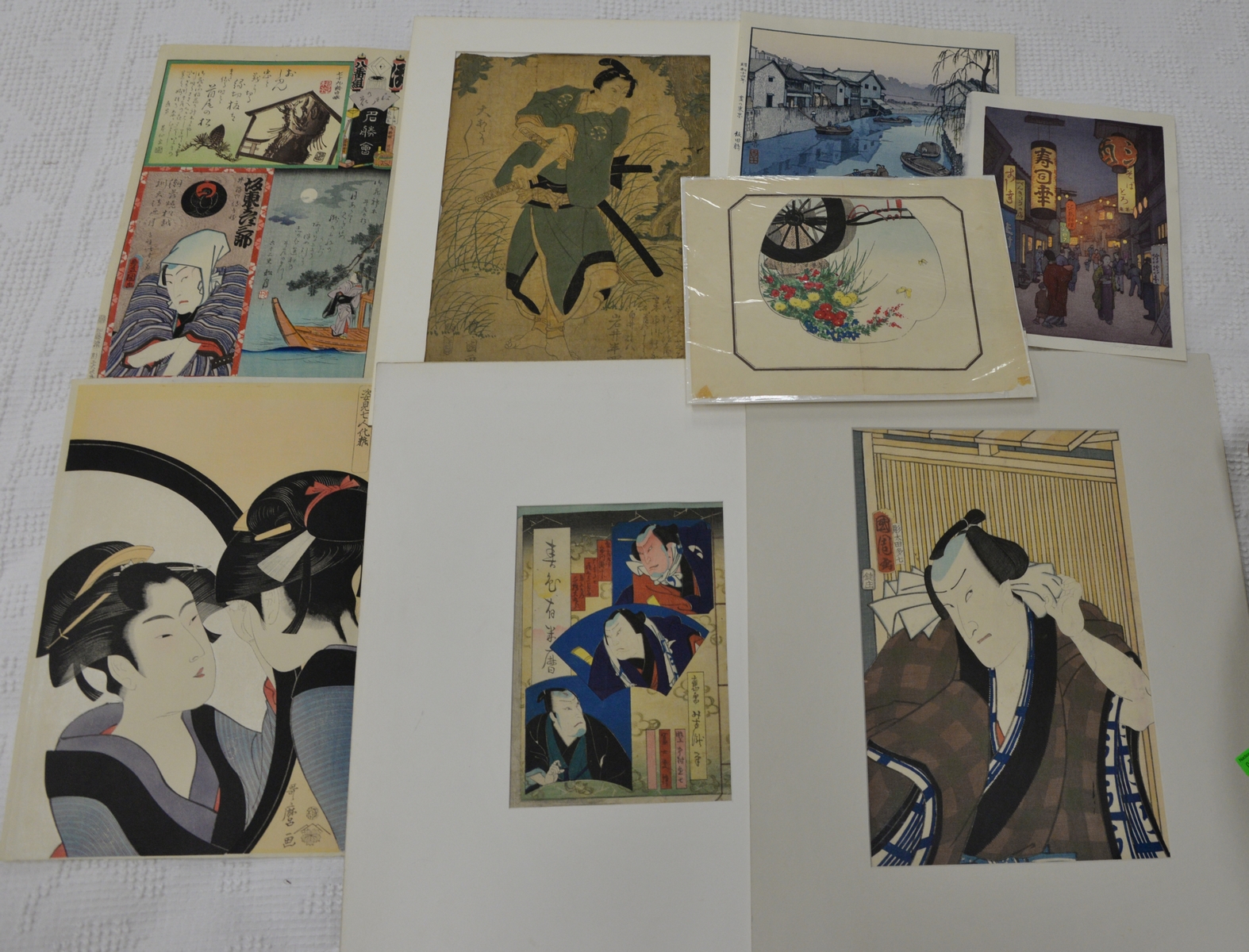 Nine framed pieces to include watercolor French market signed Choquet, oil on paper winter landscape scene signed Marino C., Betsy Pinover Schiff photograph Marigolds & Broom signed, two oil on canvas abstracts unsigned, and four prints.