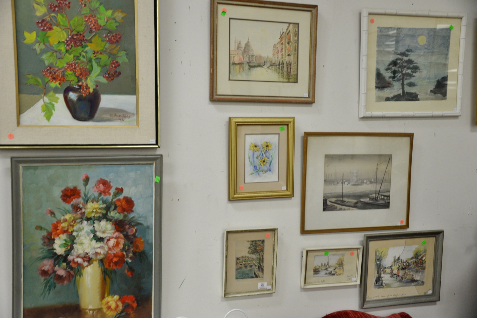 Large group of paintings and etchings to include colored engraving Paris, G. Dinchat two Paris Notre Dame by Robys Gross, watercolor of canal signed Giorgi, watercolor still life of flowers, watercolor harbor unsigned, watercolor pine tree, two colored engravings signed lower right A. Eritchenko, still life of flowers signed H. Comko, still life of flowers signed lower right M Har Dacz 1983, and still life with plaster figure Akos.. sight sizes 4 x 6 to 24 x 18