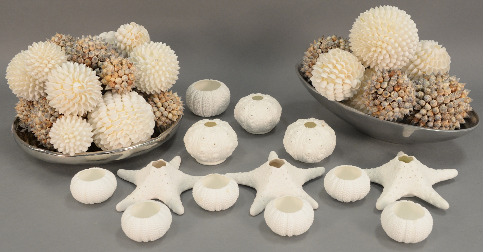 Beach seashell decorative dcor group having two bowls with round seashell balls dia. 3in. to 5 1/2in. and a group of 13 Roost porcelain sea life candle votive/tea light holders in the shape of sea urchins and starfish.