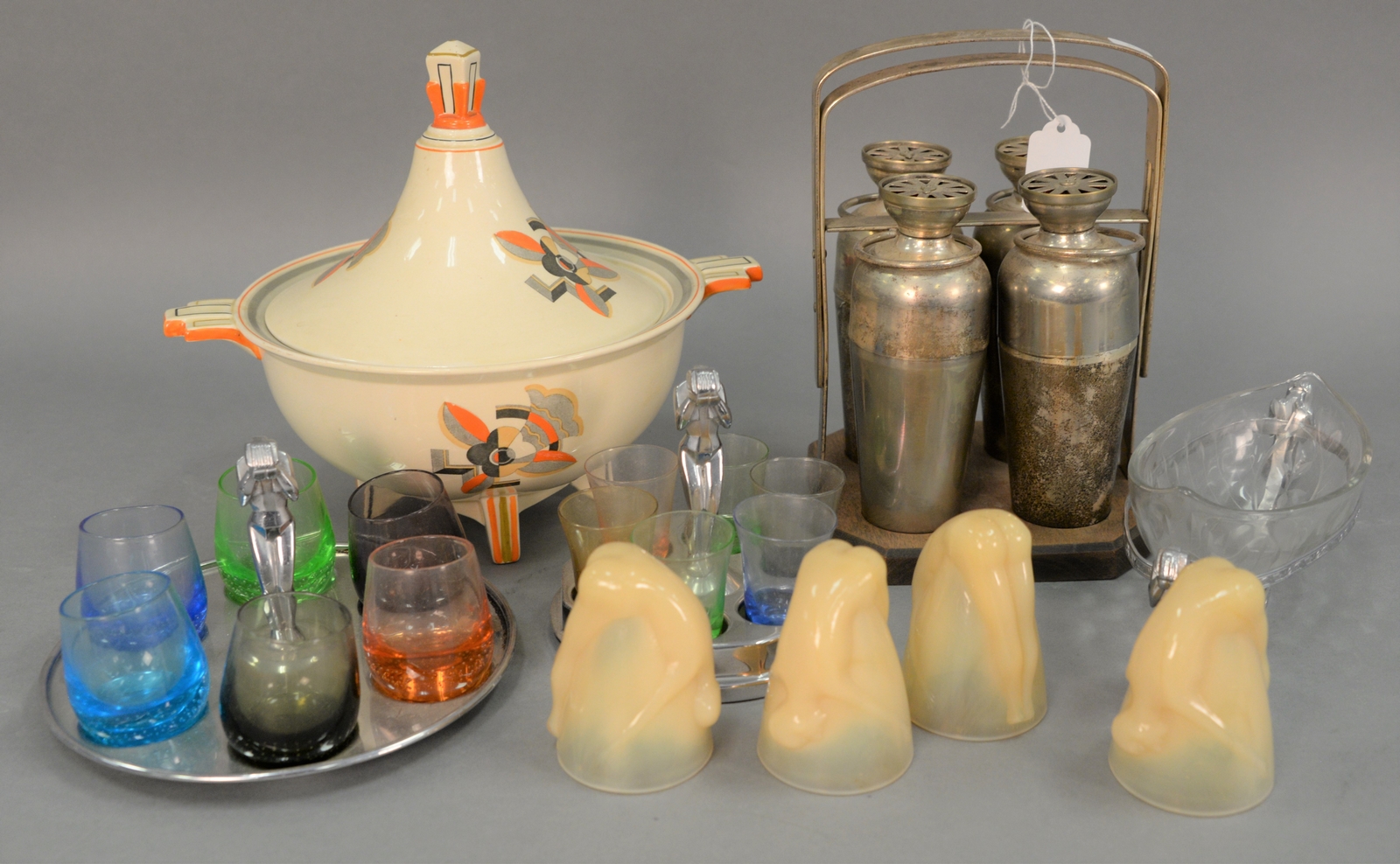 James Napier cocktail shaker set including two art nouveau shot glass trays with nude woman center, set of four art nouveau glasses with nude woman, and a modern Whieldon Chalon covered serving dish. 3 1/4in. to 9in.