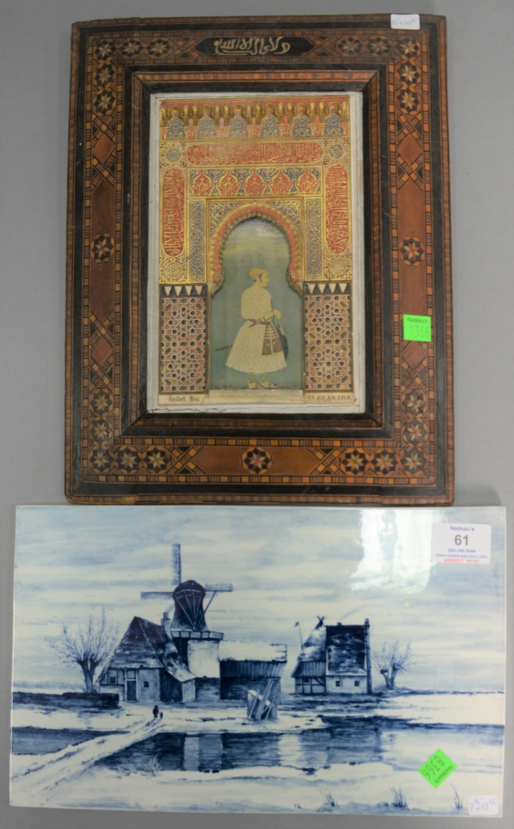 Two piece lot to include a Delft blue and white plaque 7 3/4 x 12 3/4 and inlaid framed three dimensional Middle Eastern plaque marked Rafael Rus 18 Granada 8 1/2 x 5 1/2.