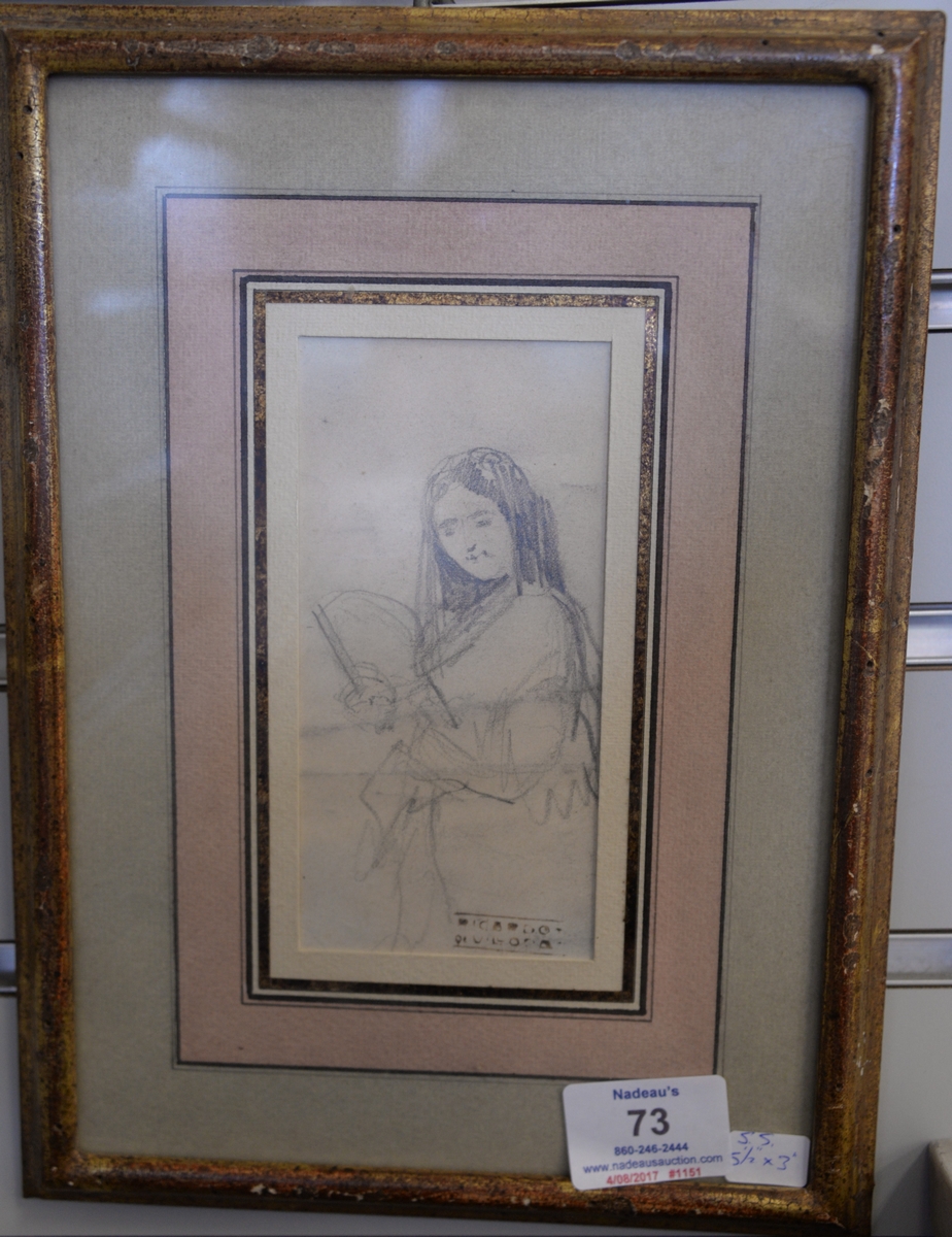 Ricardo Villodas y de la torre 1846-1904 pencil sketch of woman with fan, Ricardo de Villodas stamp, Palm Beach Galleries label on verso. sight size 5 1/2 x 3