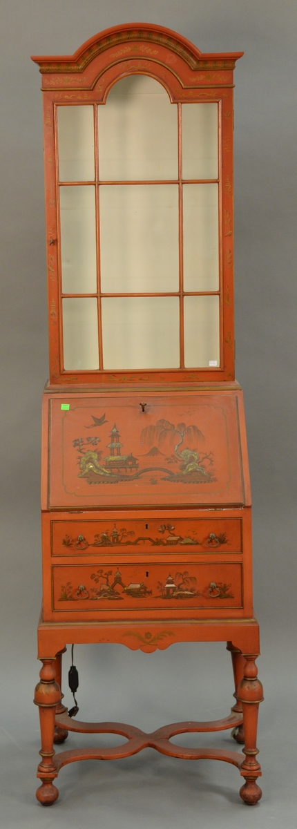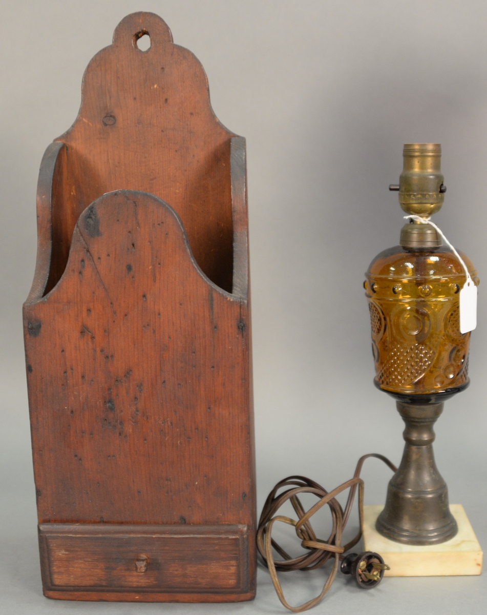Two piece lot to include a primitive pine wall mounted candle box with one drawer having remnant of red paint and Amber glass oil lamp with base. candle box: ht. 19 3/4in., lamp: ht. 15in.