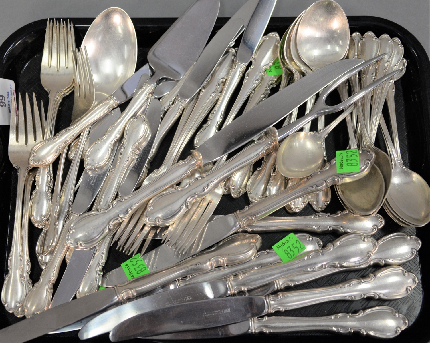 Forty-three Skyros dinnerware set including fifteen ceramic white glazed dinner or luncheon plates with fourteen matching soup bowls, fourteen light blue glazed large dinner plates all marked Skyros hand painted in Portugal by Le Faubourg. 9in., 12 1/4in., & 14 1/2in.