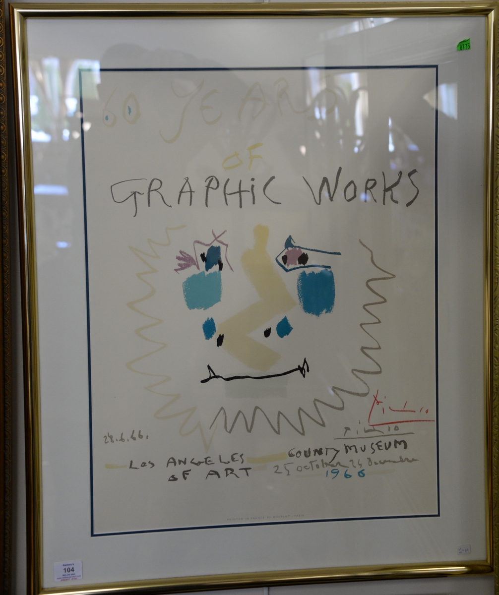 Colored lithograph, Picasso 60 Years of Graphic Works, Los Angeles County Museum of Art 25 October 25 December 1966, printed in France by Mourlot-Paris. sight size 26 x 20