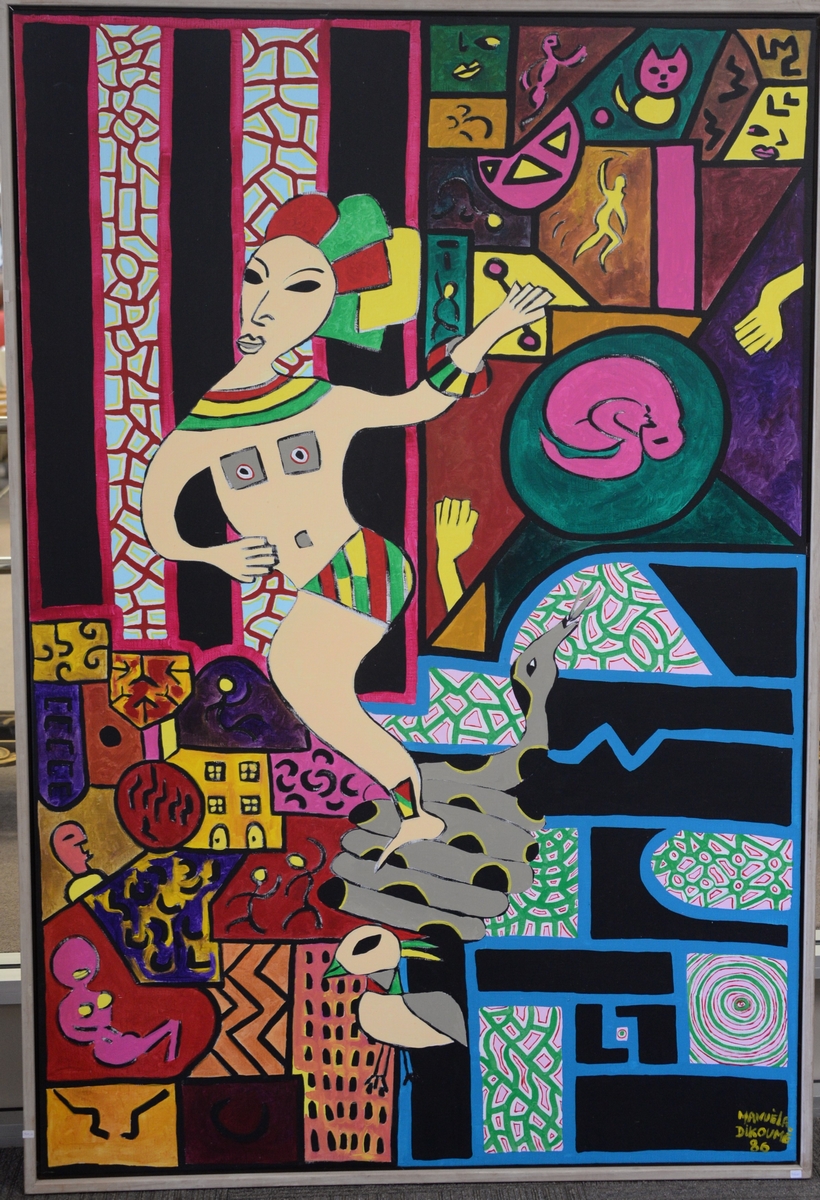 Enrique Gandolfo 20th century oil on masonite Paisaje Tropical 1975, signed and dated lower right E Gandolfo 75, Wildenstein Arte label on verso. 6 3/4 x 17 1/4