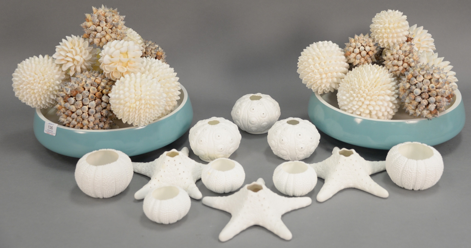 Beach seashell decorative dcor group having two bowls with round seashell balls, two matching vases ht. 18in. , and a group of 11 Roost porcelain sea life candle votive/tea light holders in the shape of sea urchins and starfish.