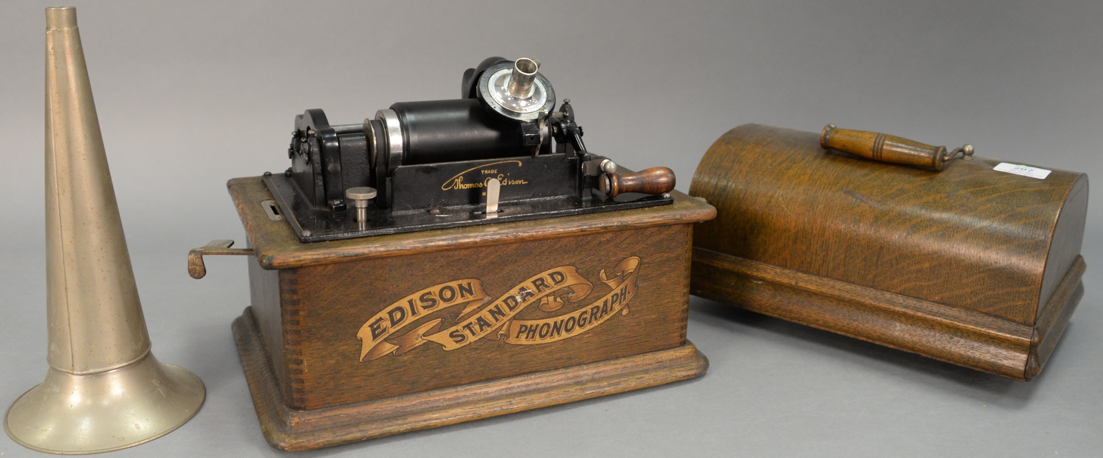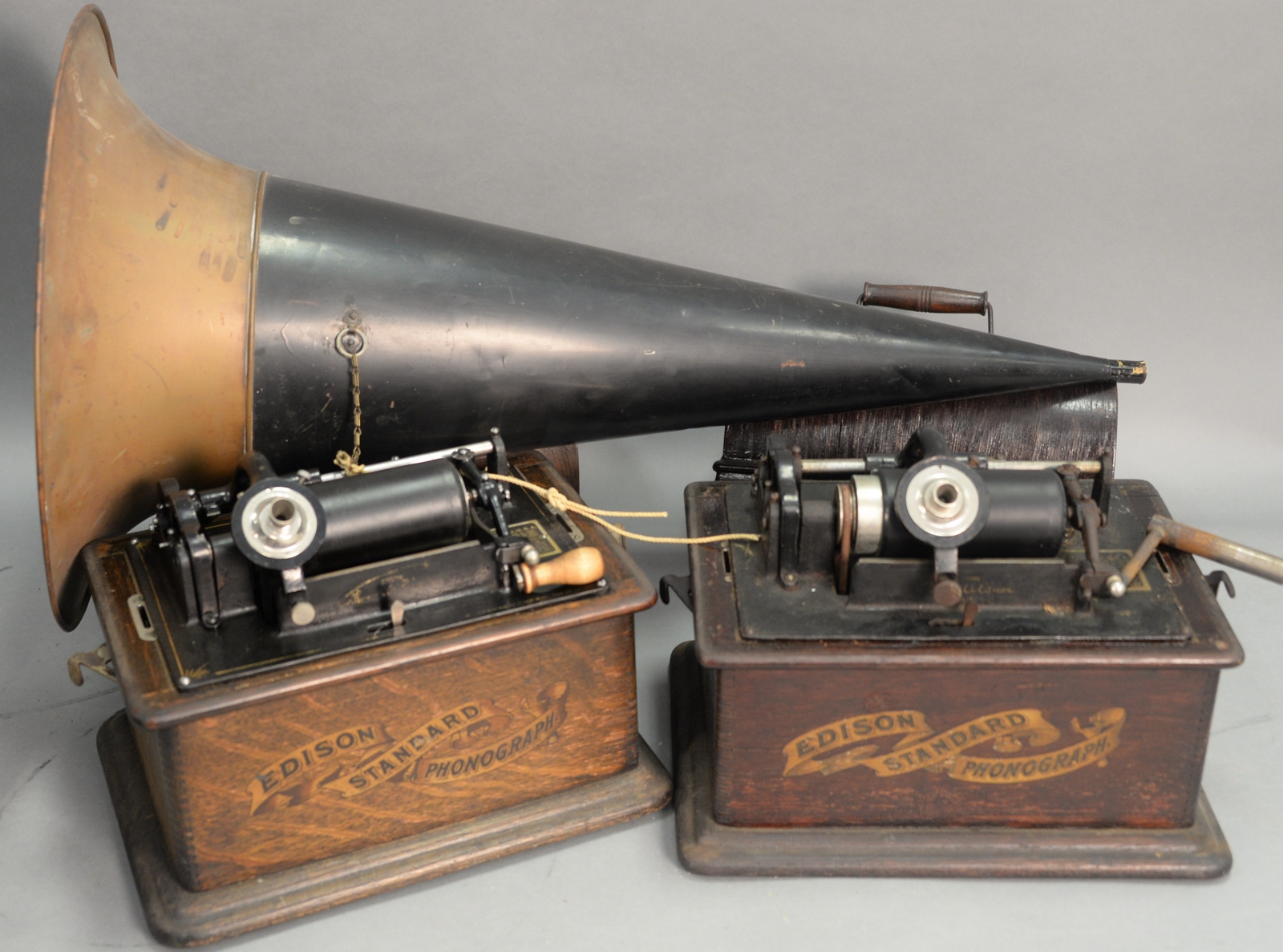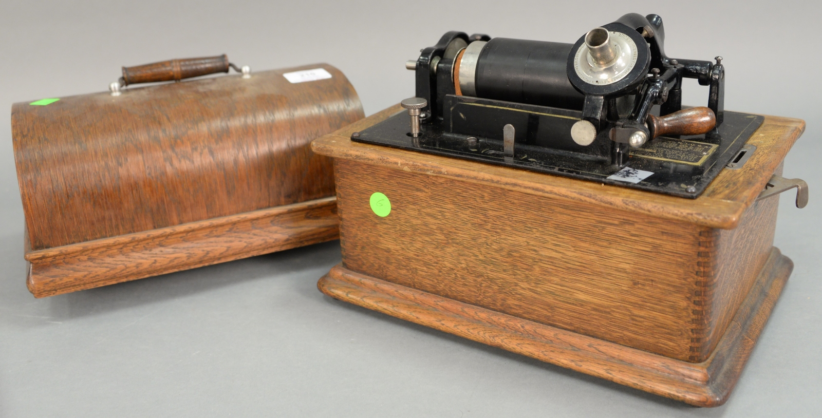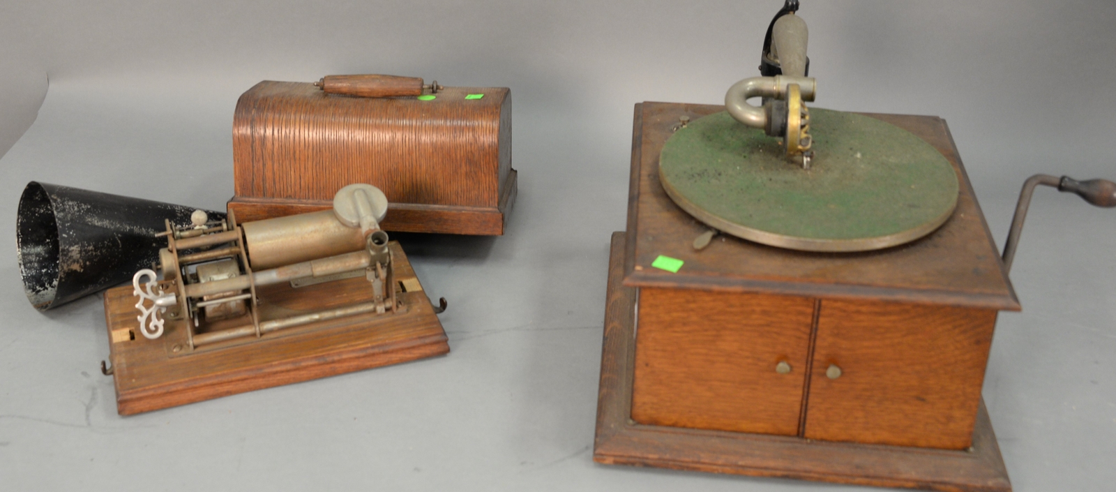 Two phonographs The Graphophone American Type B and a disc phonograph, one with 10inch horn. ht. 6 1/4in., wd. 11 3/4in., dp. 7 1/4in. & ht. 10 3/4in., wd. 14 1/2in., dp. 13in.