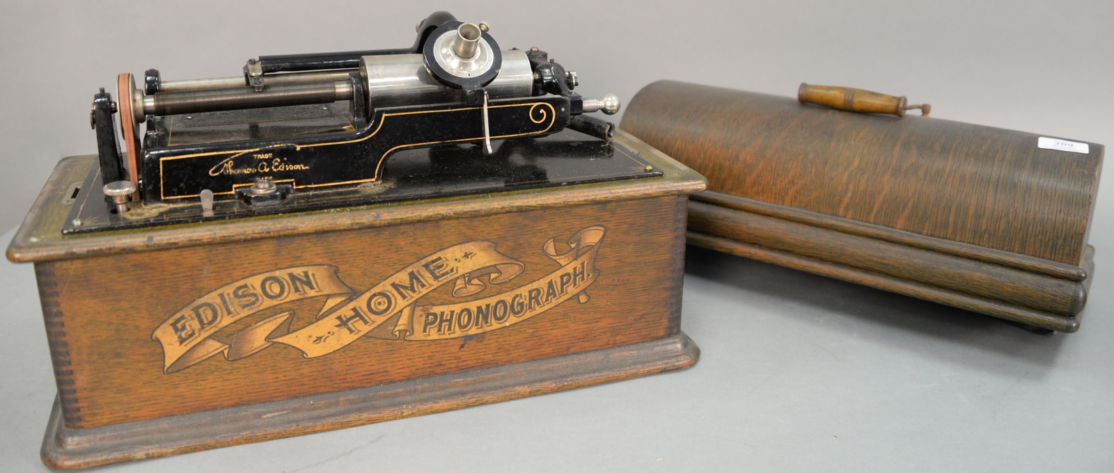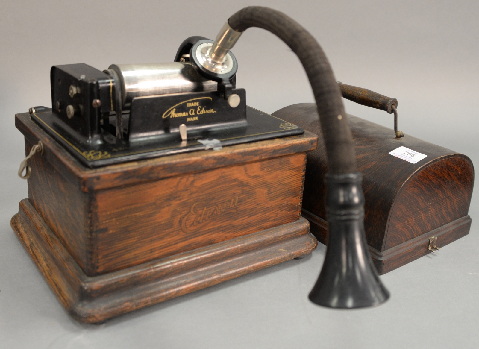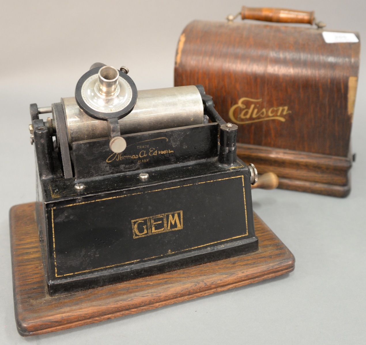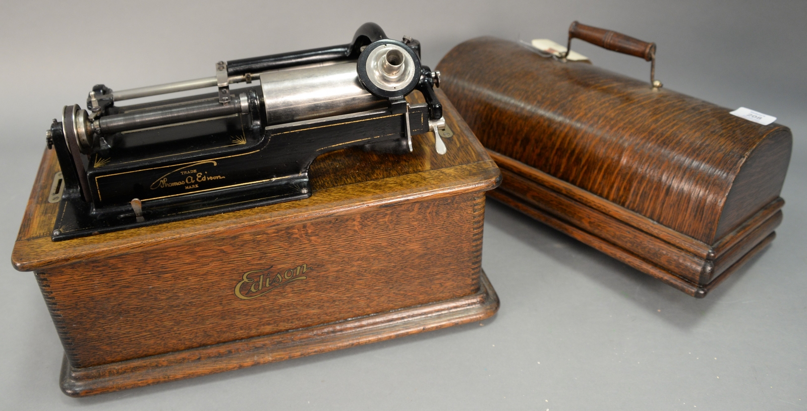 Two phonographs The Graphophone American Type B and a disc phonograph, one with 10inch horn. ht. 6 1/4in., wd. 11 3/4in., dp. 7 1/4in. & ht. 10 3/4in., wd. 14 1/2in., dp. 13in.