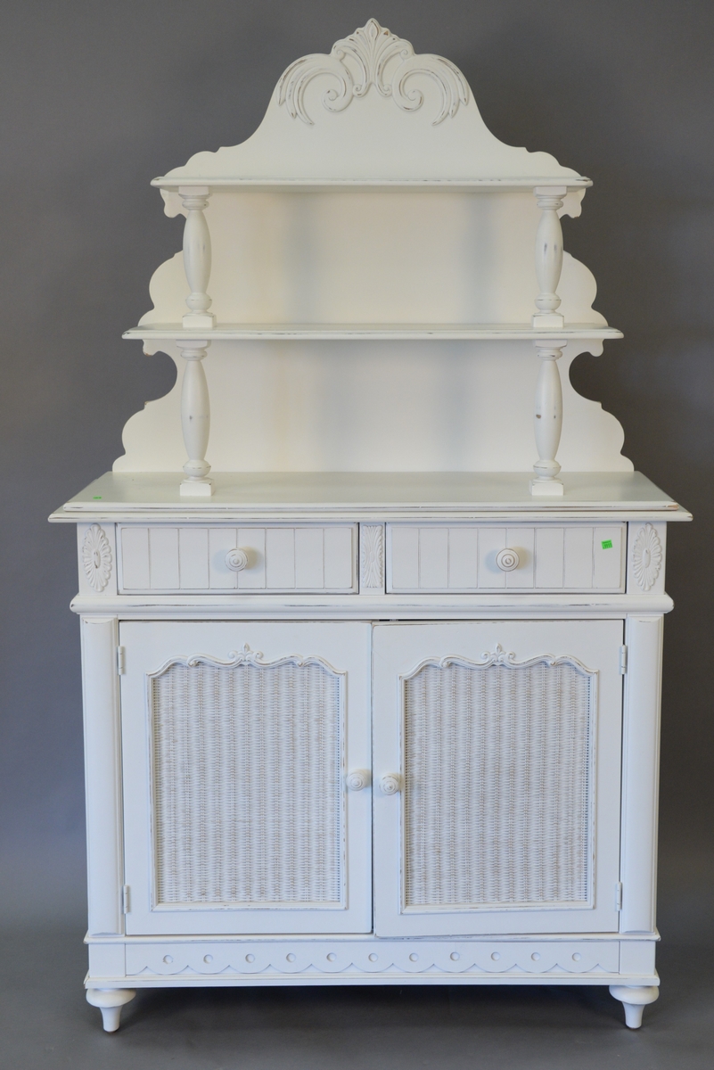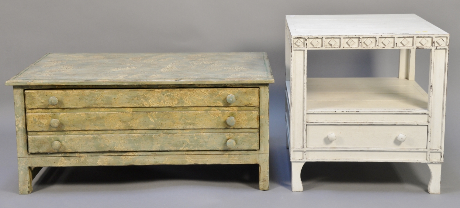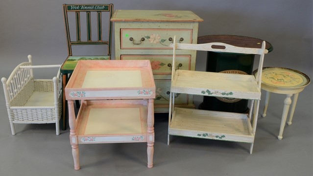 Six piece lot to include painted side chair, three painted stands, one wicker magazine rack and addtional occasional table.Five piece painted lot including coffee table, small chest, two stands, and a chair. coffee table: ht. 19in., wd. 42in., dp. 24in.