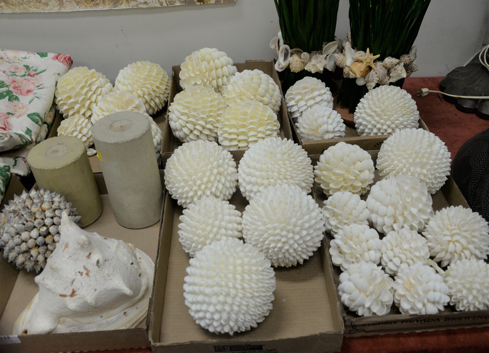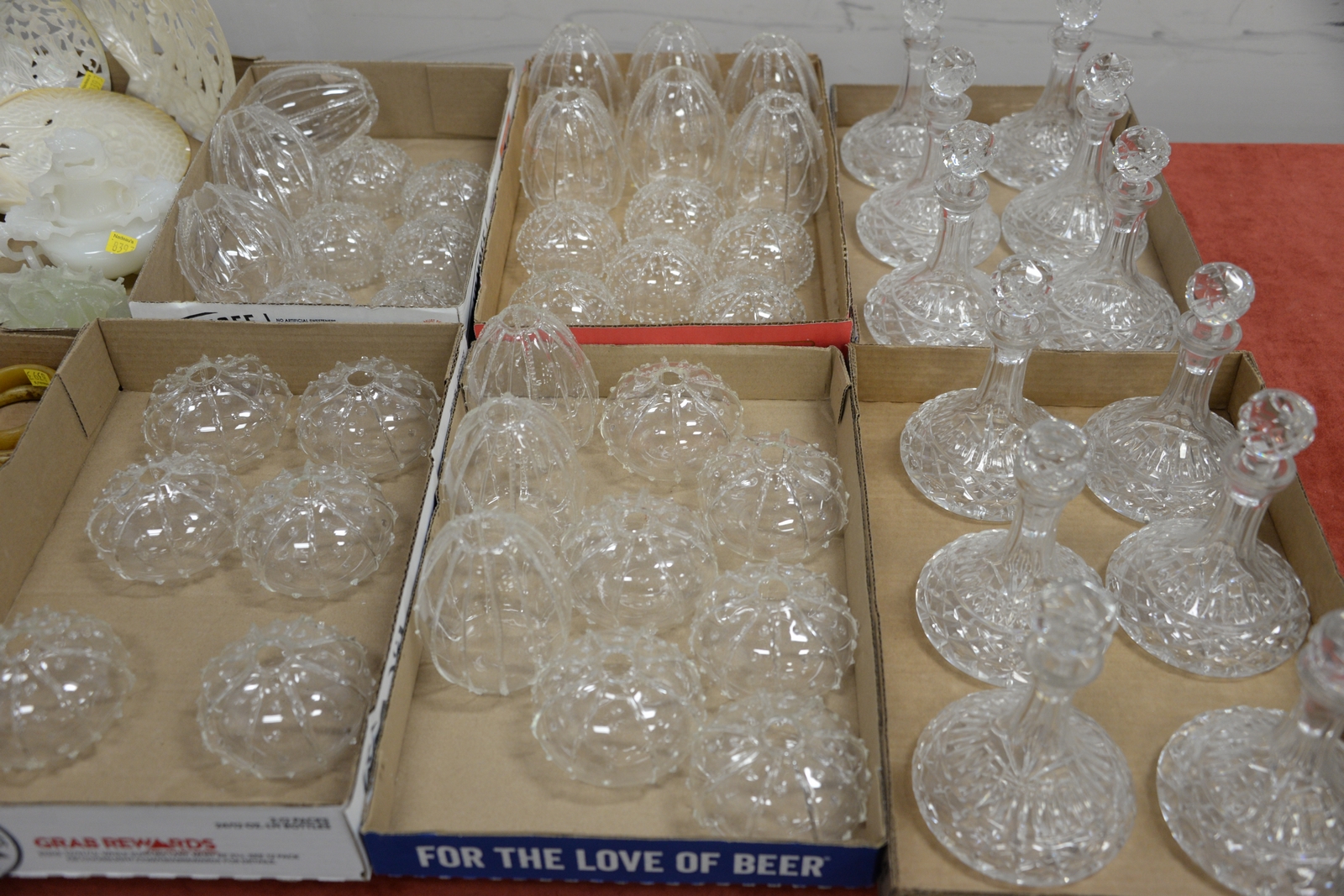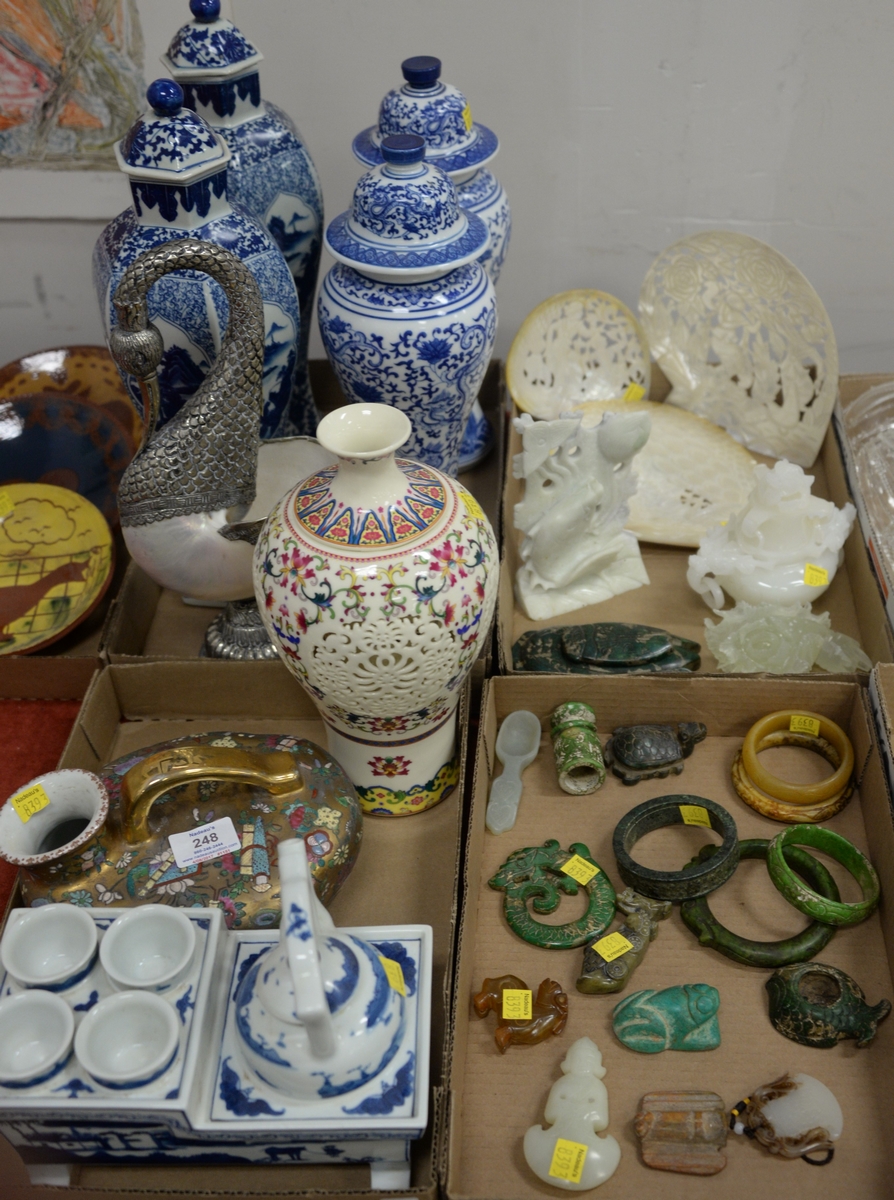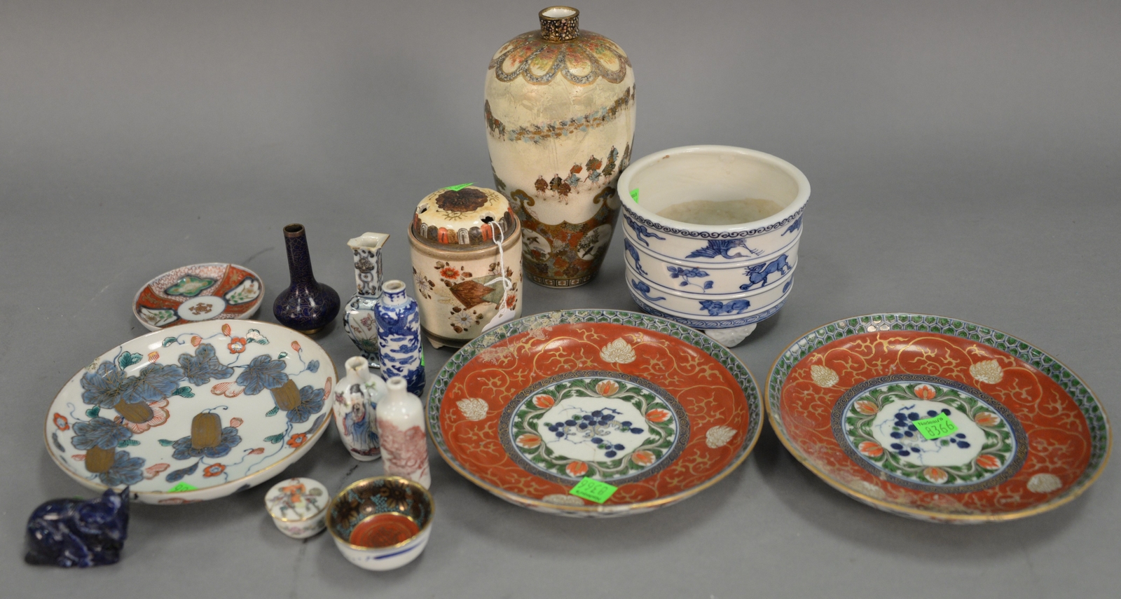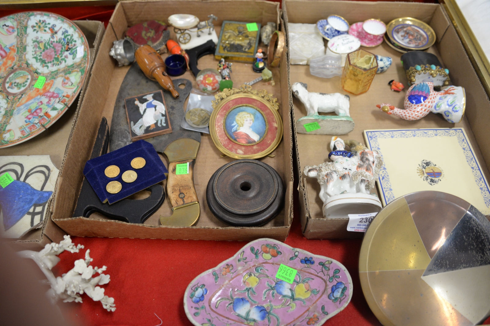 Three tray lots of Staffordshire, Herend, Rose Famille plates, Mid-Eastern partial tile, two Spode mini cups, mini painting, meat cleaver, curios, etc.