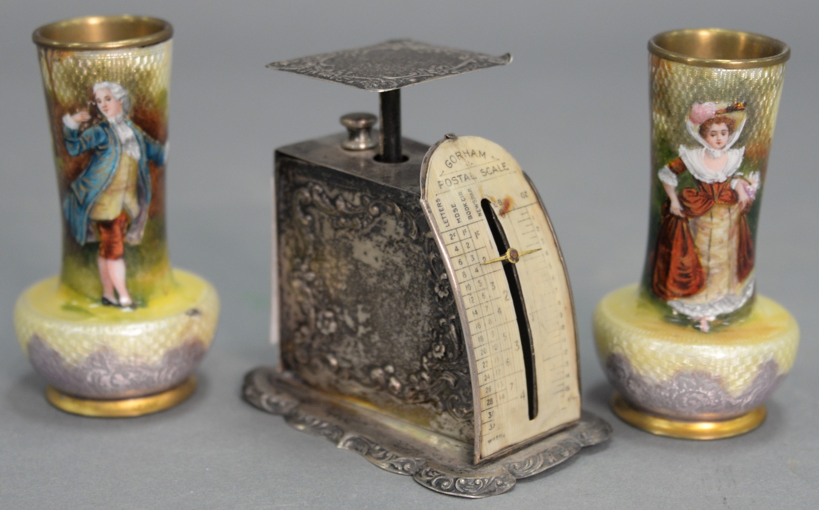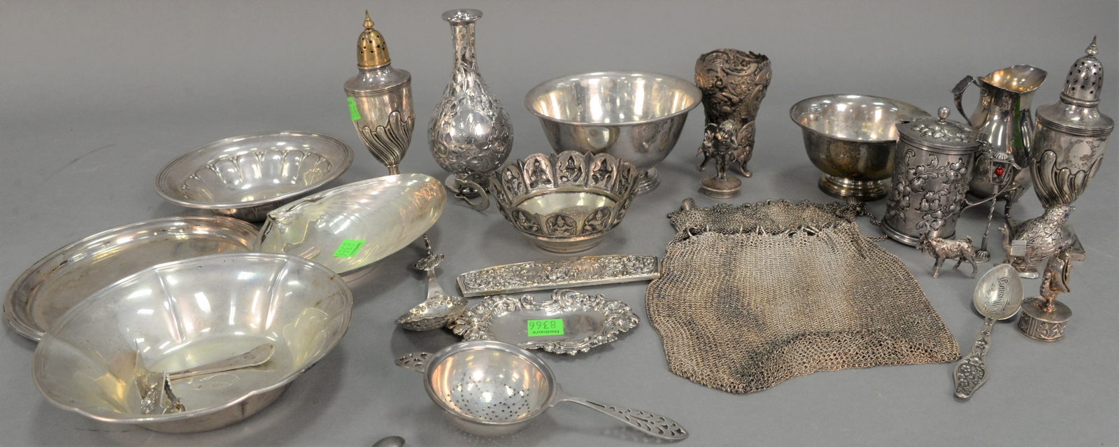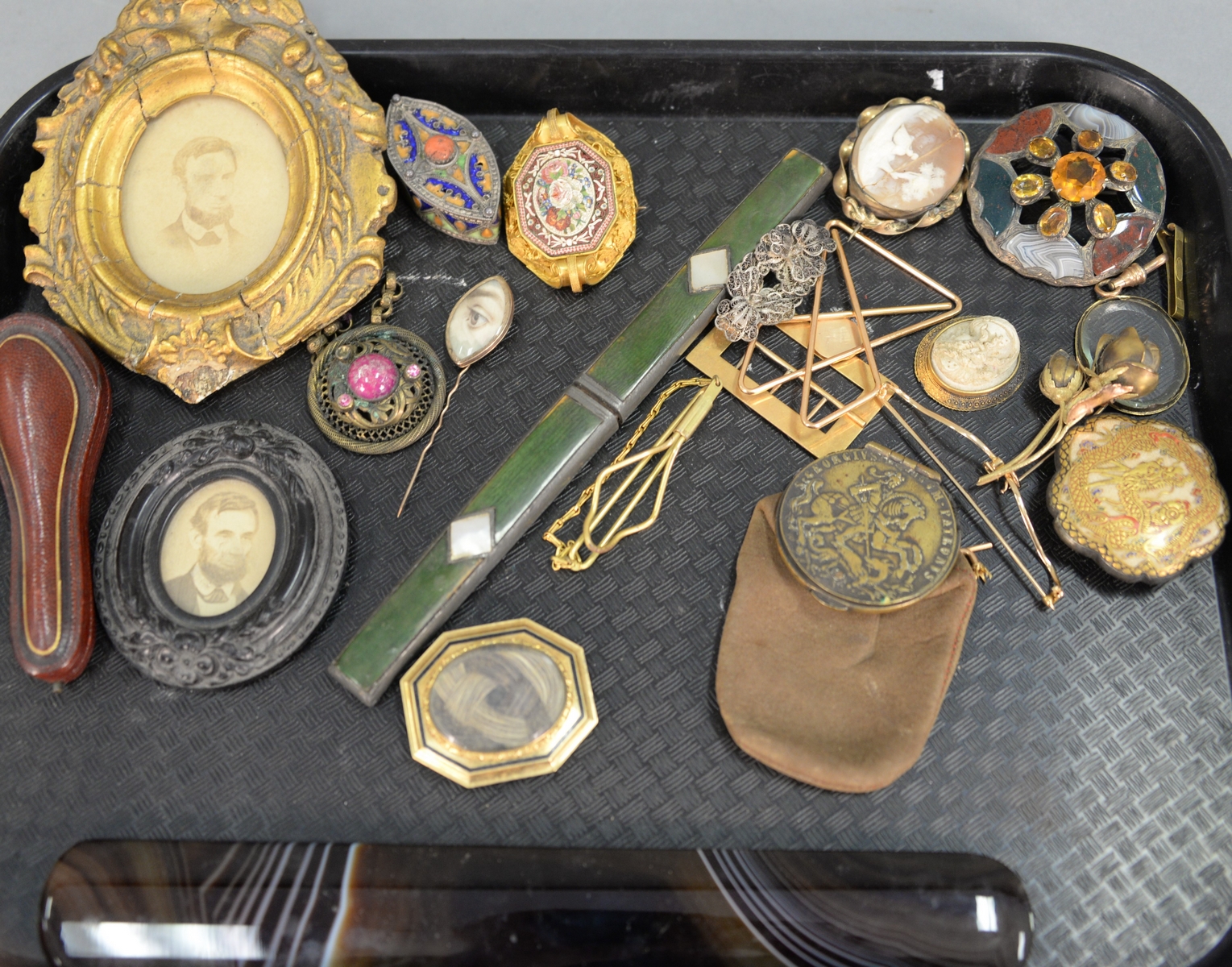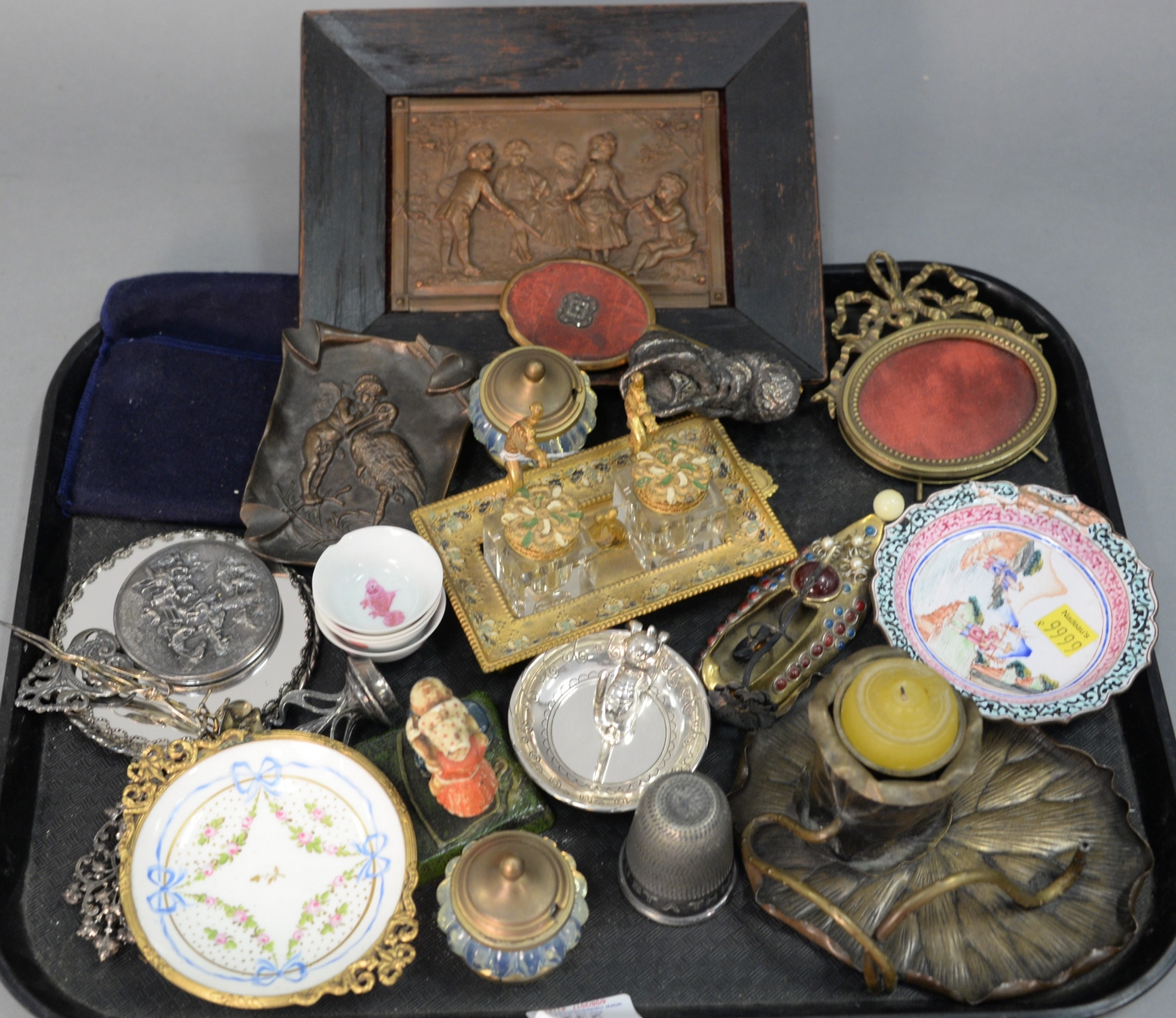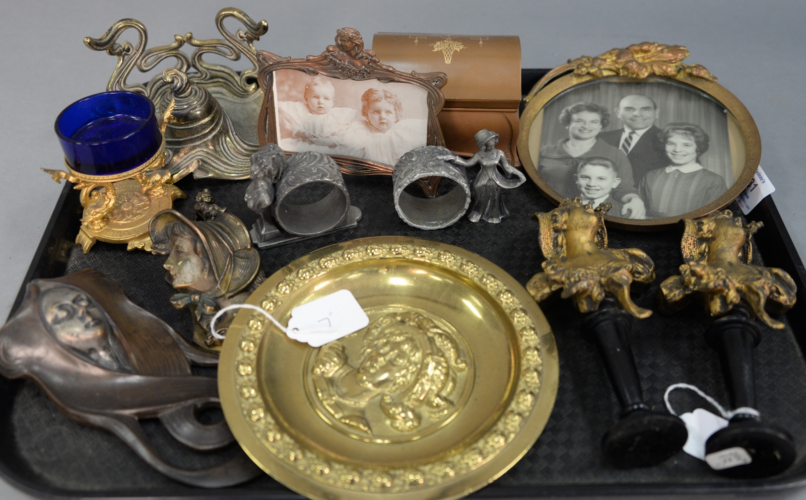 Tray lot to include Schutz Makers bronze dish, art nouveau inkwell, two picture frames, paperweight and paper clip, Benedict Adam bronze trinket box, two figural napkin rings, and a pair of small busts of women.