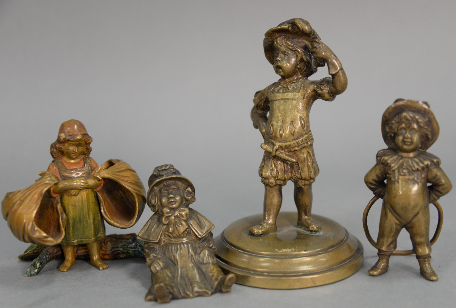 Four small bronzes including two miniature bronze circus boy, small girl sitting, and a cold painted bronze of a young peasant girl. ht. 2 1/2in. to 5in.