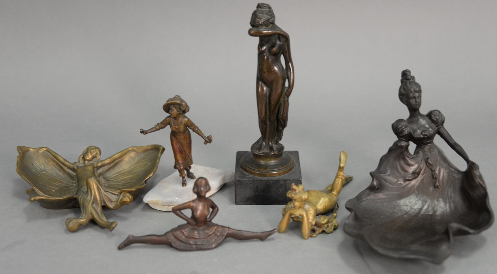 Group of six bronze women including erotic ballerina, art nouveau butterfly dish, nude standing figure, Victorian girl marked Austria, small dish, and a small woman on a stone. ht. 1 3/4in. to 6in.