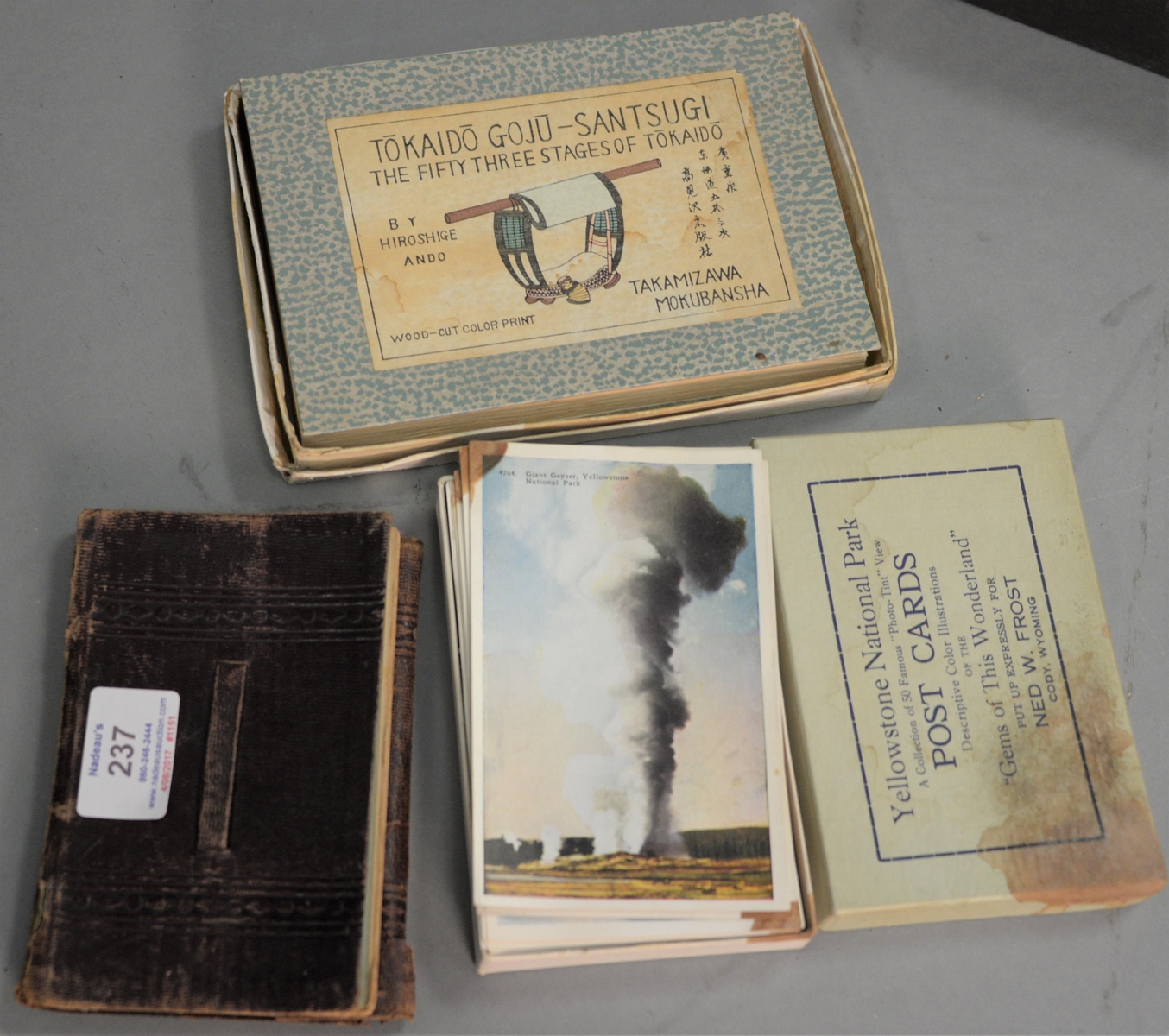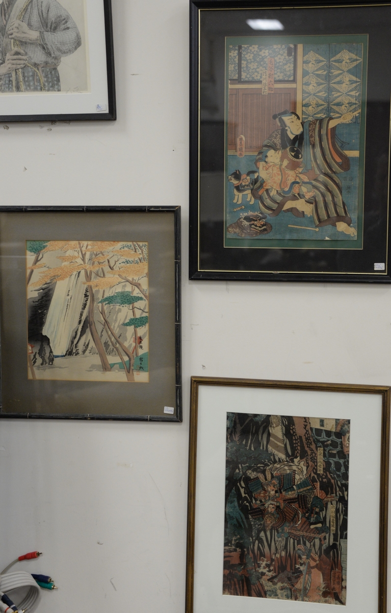 Group of seven Japanese woodblocks and etchings including two landscapes, three warrior figures, two pencil signed lower left illegibly of Wood Carver and Peddler Woman. 12 1/2 x 8 3/4 to 11 3/4 x 10