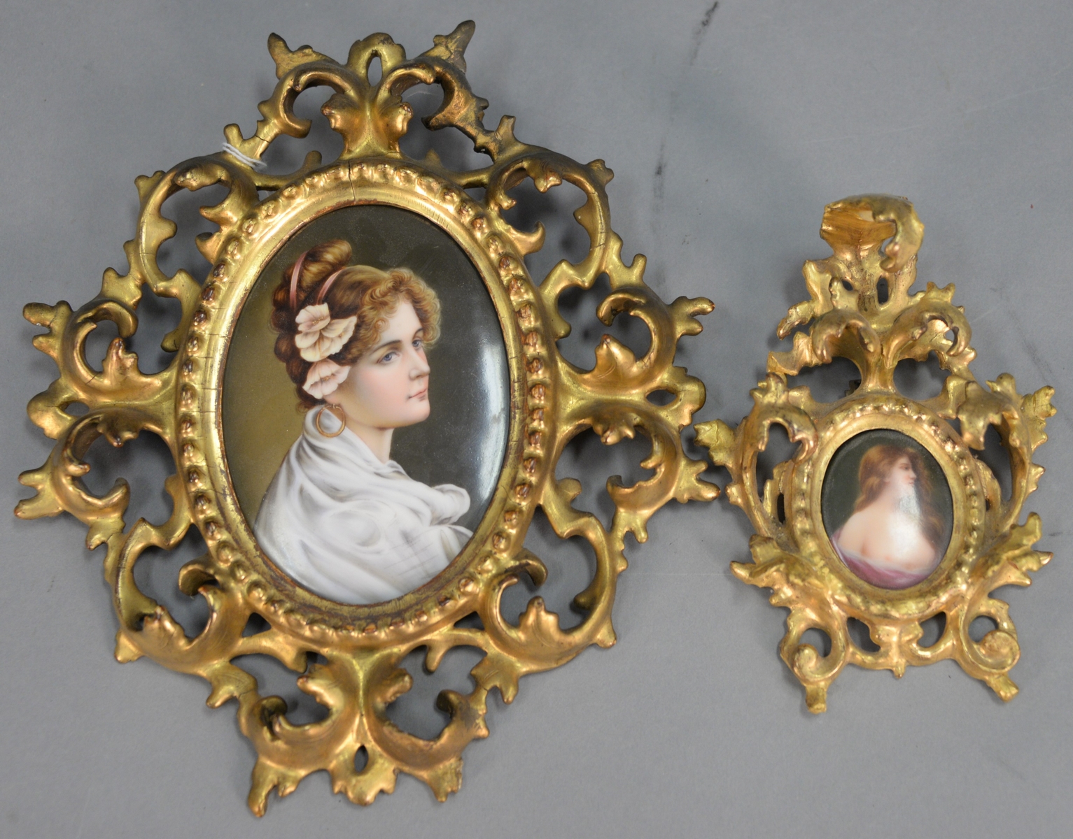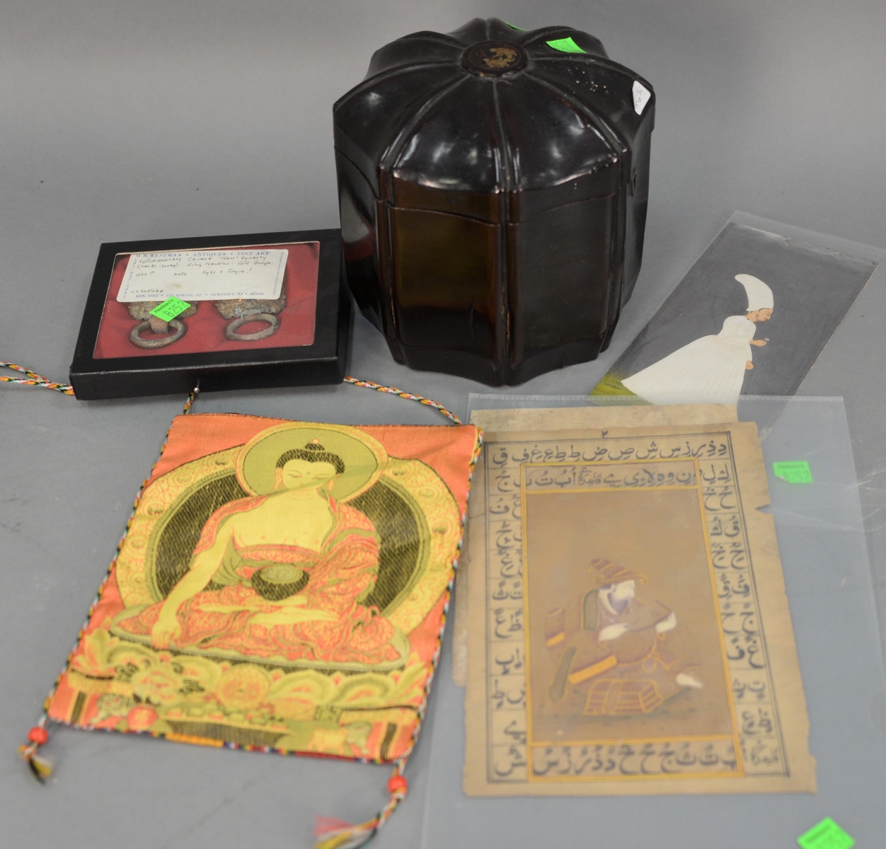 Six piece lot to include three miniature Mid-Eastern paintings and a pair of lion face gilt decorated pulls, and Asian lacquered tea box with lead liner ht. 6 1/2in.