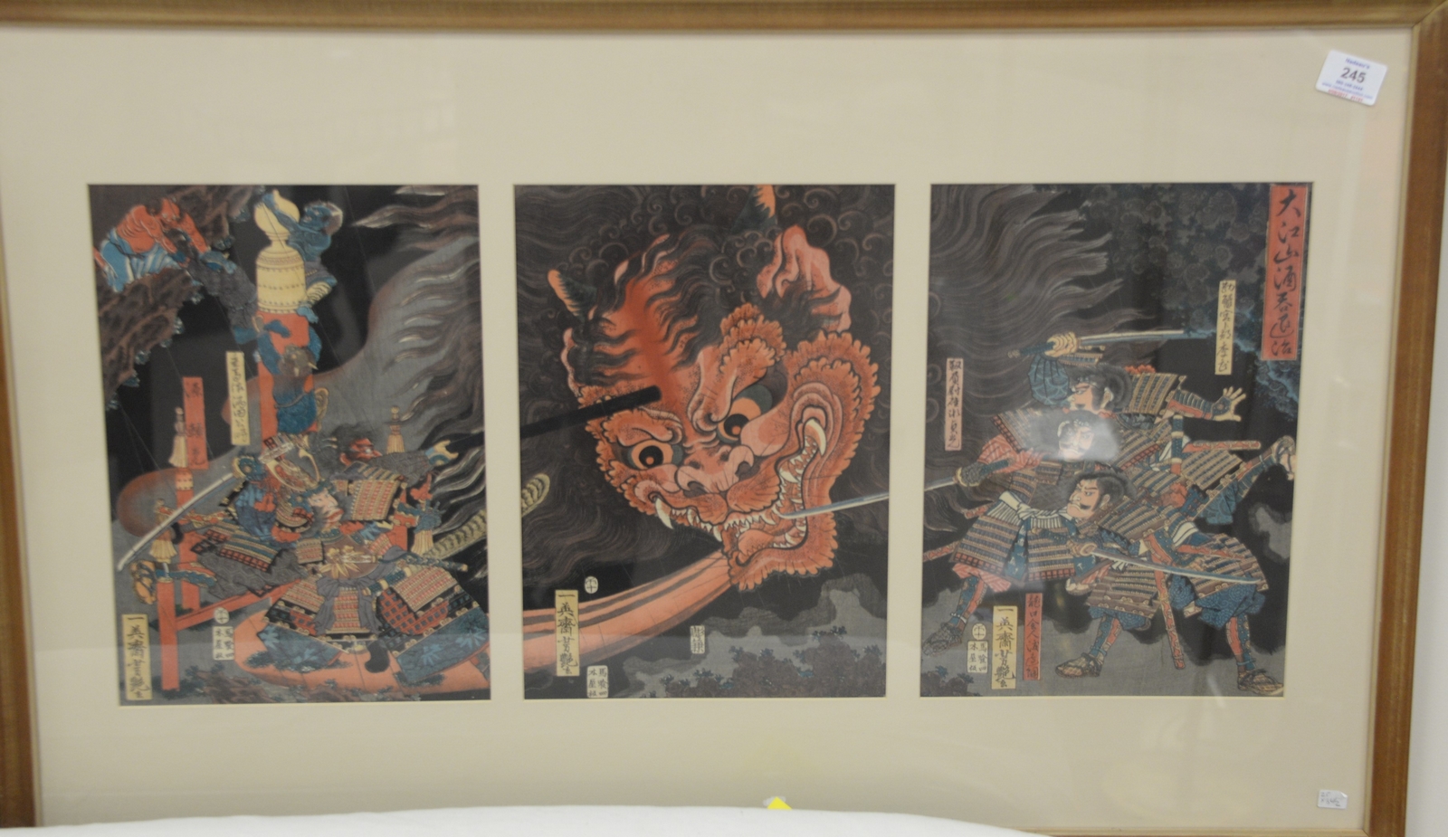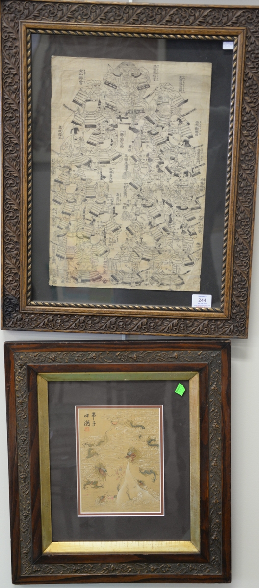 Three Chinese watercolors including a five claw dragon watercolor on silk, a watercolor on paper of Chinese Parade, and a black and white with Japanese Warrior figures. 17 x 11 1/2, 15 x 30, and 8 1/2 x 6 1/2