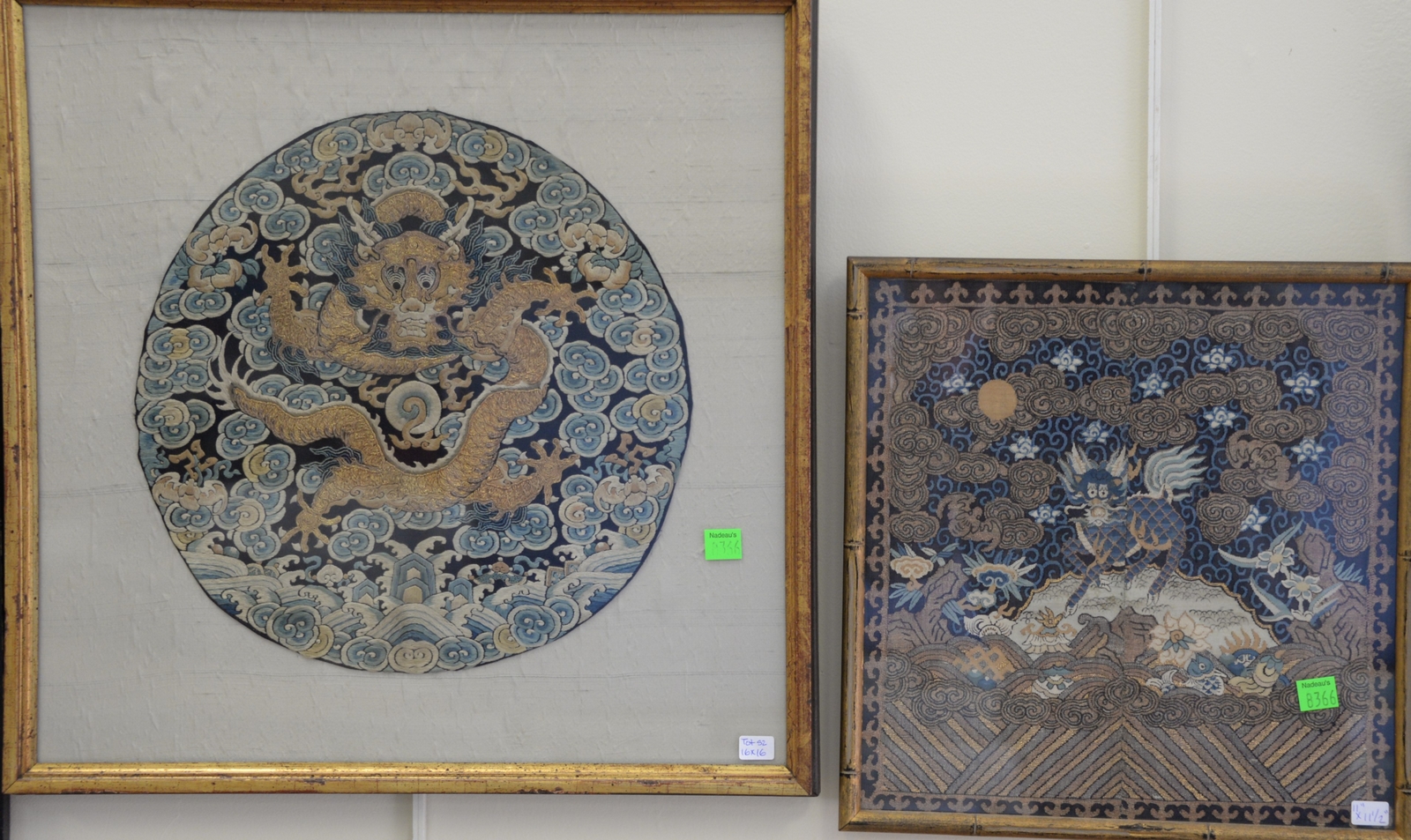 Four framed Chinese silk embroidered rank badges to include round five claw dragon with gold threading 16 x 16, two with phoenix birds 11 x 11 1/2, and a square badge with foo dog.