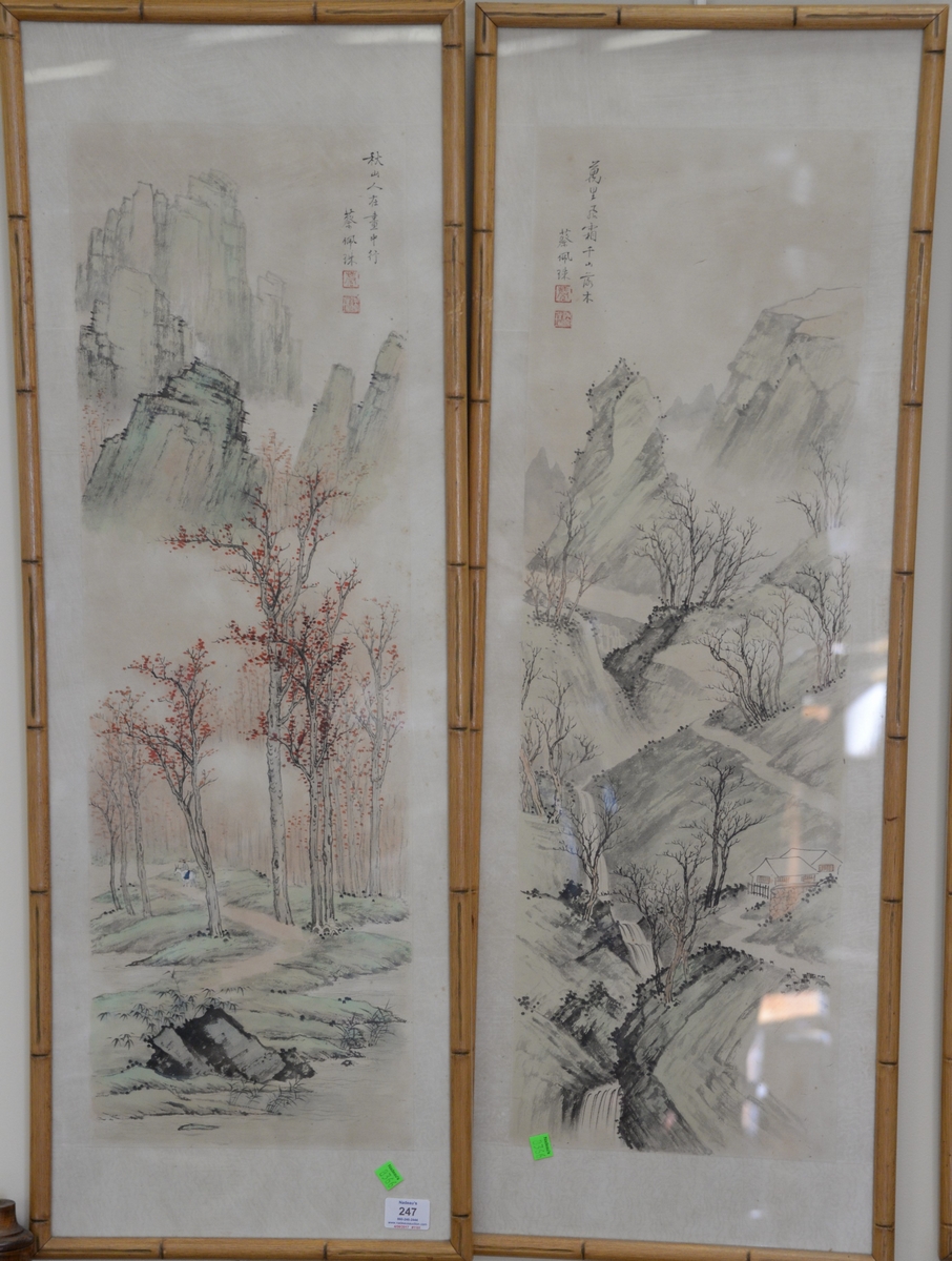 Nine piece lot with Chippendale style mirror plus eight framed pieces to include four watercolor on paper framed Chinese scrolls, two Oriental prints, and two prints of ships. scroll image size 34 x 11