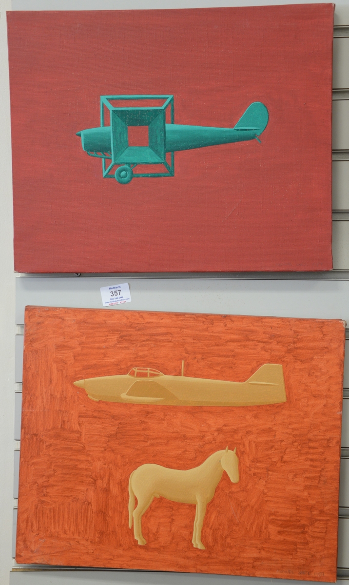 Set of four oil on canvas paintings by Manuel Saiz b. 1961 including Avion Verde, Loire-Nieuport 1987, Avion Ocre Con Fondo Negro, and Avion Con Fondo, all signed Manuel Saiz. 13 x 16