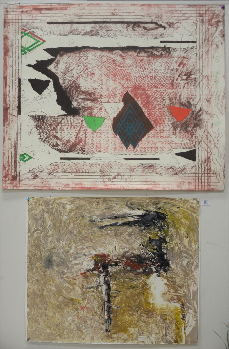 Group of nine unframed abstract pieces: six David James abstract colored lithographs, three Anthony Pilley mixed media on linen paper/oil on paper including Carnival, Pos Musicos, and Girl with Radio Microphone all signed Anthony Pilley. 19 1/2 x 14 to 18 x 23.