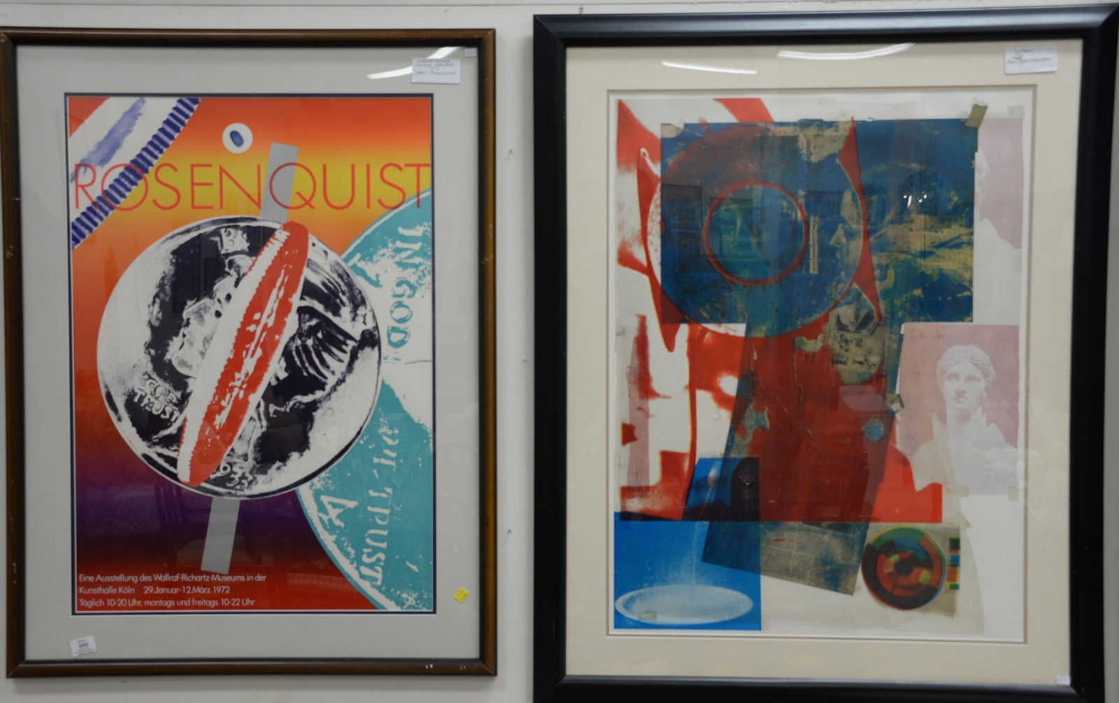 Three framed prints/posters to include After Robert Rauschenberg 1925-2008 colored print Quarry, Giancarlo Impiglia Grand Tier pencil signed and numbered 223/250, and James Rosenquist Eine Ausstellung des Wallraf-Richartz Museums poster. sight sizes 33 x 25, 30 x 22, & 32 x 22