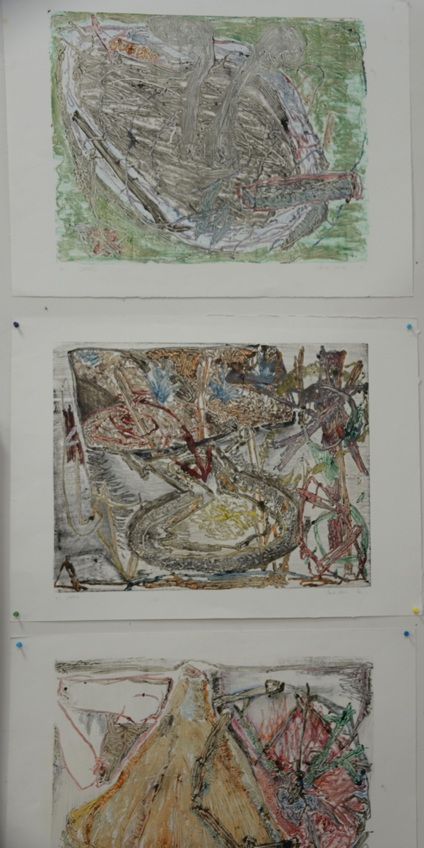 Three unframed lithographs including June Leaf b. 1929 abstraction lithograph signed in pencil lower right June Leaf and numbered 14/20, a Terence LaNove colored lithograph 49/65 signed in crayon 1981, and a Tom Lieber b. 1949 monotype abstract with Siegel Contemporary Art label. 31 x 37 1/2, 25 x 29 1/2, and 25 x 36