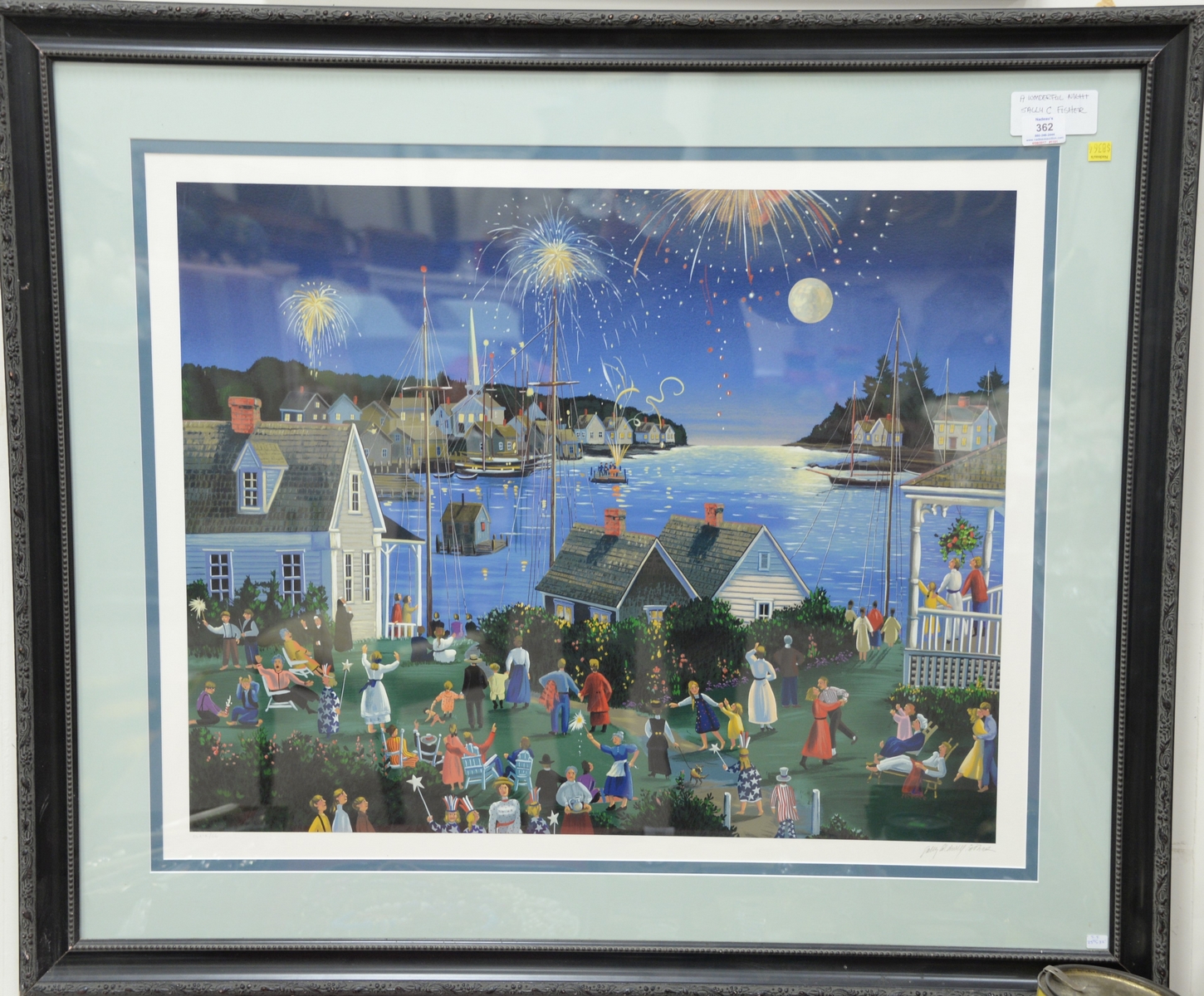 Three framed prints to include Harry Guttman serigraph pencil signed and numbered 26/300 22 x 19 and two Sally Fisher colored prints 25 x 32 & 25 x 32.