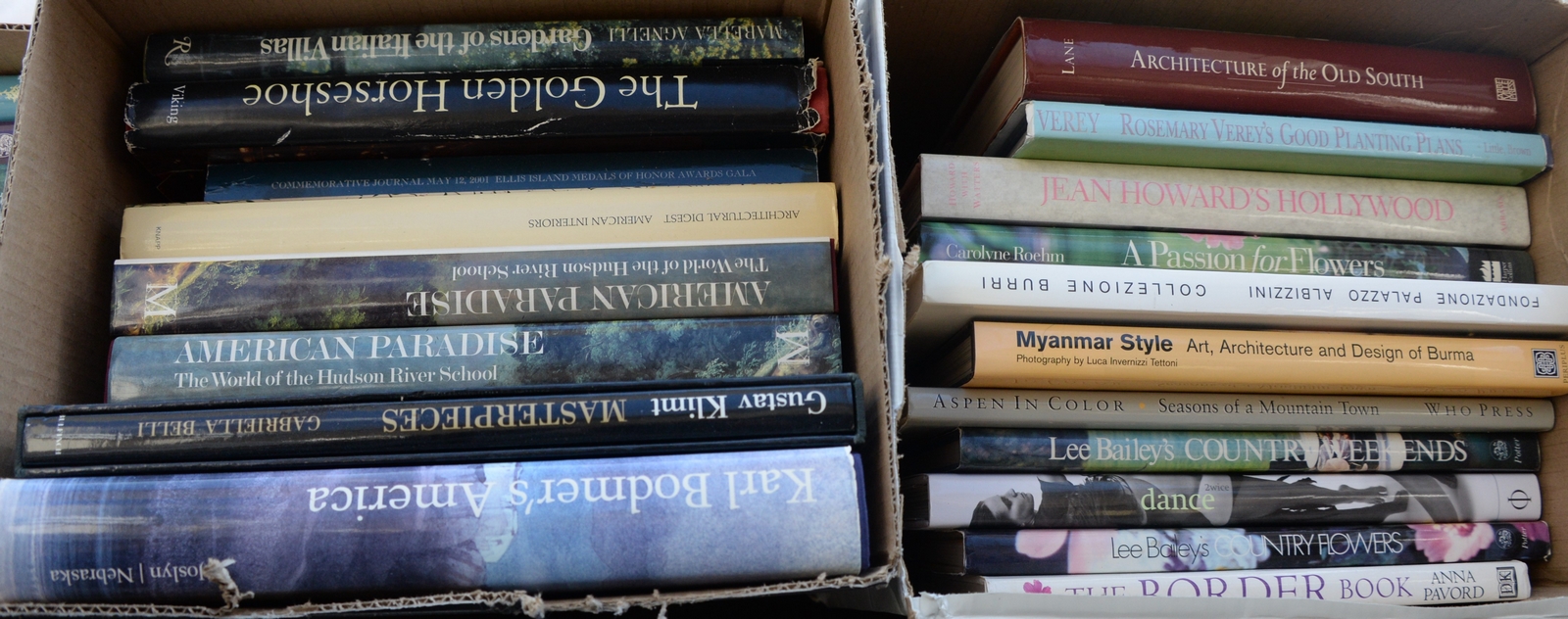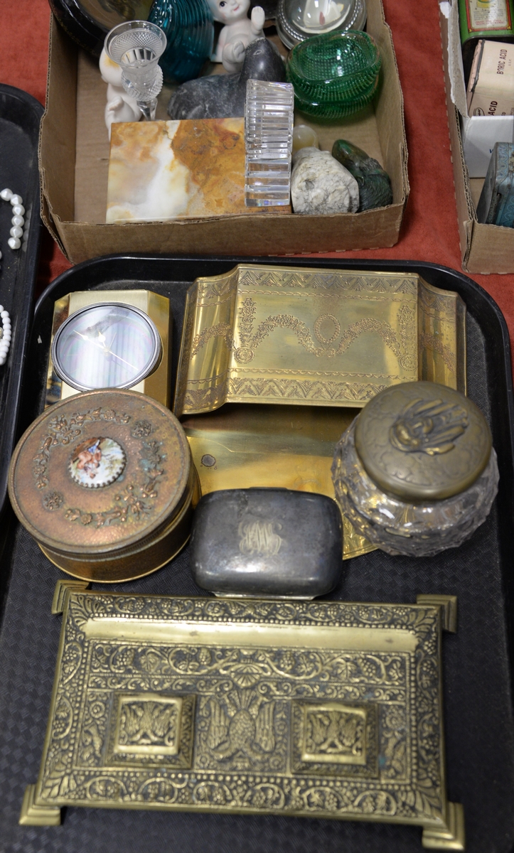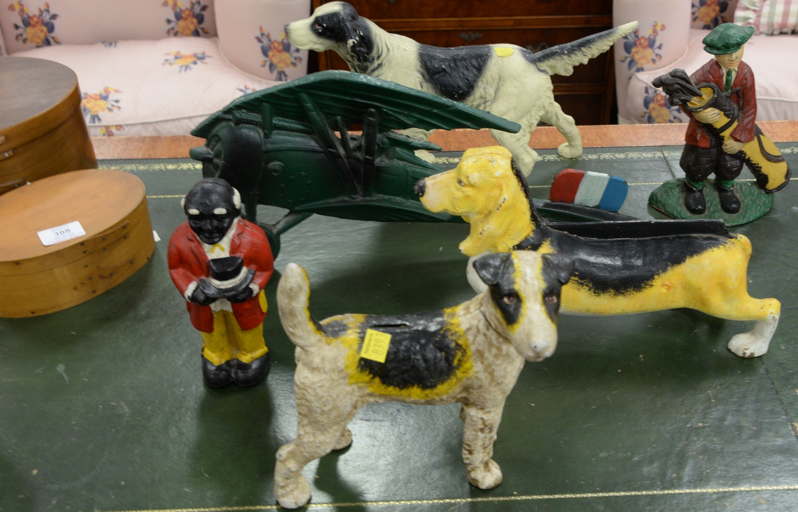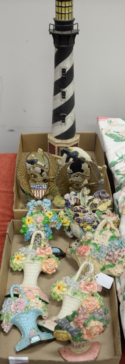 Two tray lots with iron door sops to include Cape Hatteras cast iron lighthouse door stop, cow door stop, seven basket of flower door stops, and two eagle doorstops.