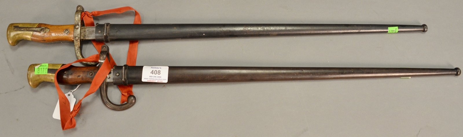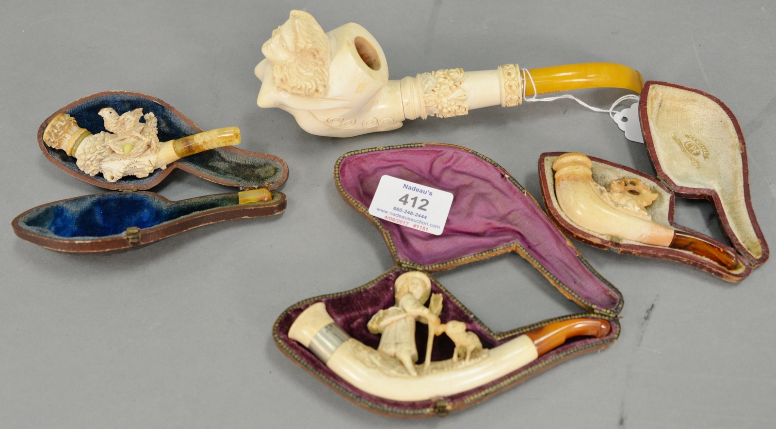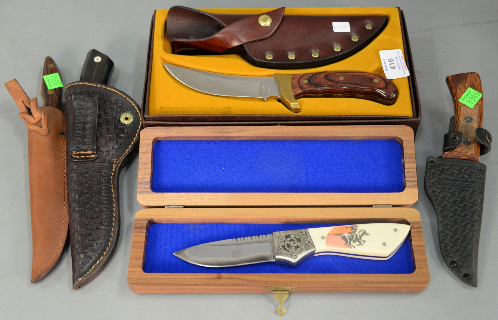 Five buck knives including Winchester DH Russell belt knife with leather sheath and original box, Estes Park Colorado Dill buck knife, Nolen Knives buck knife, and Winchester buck knife.