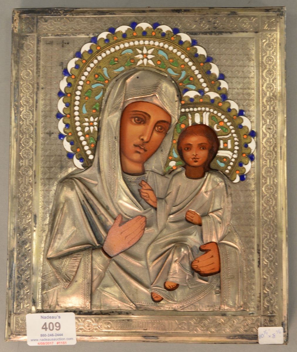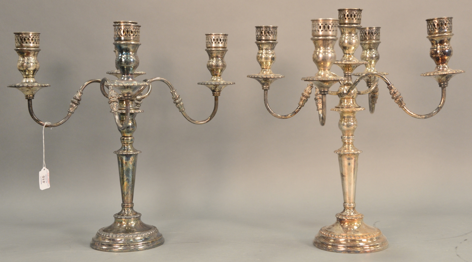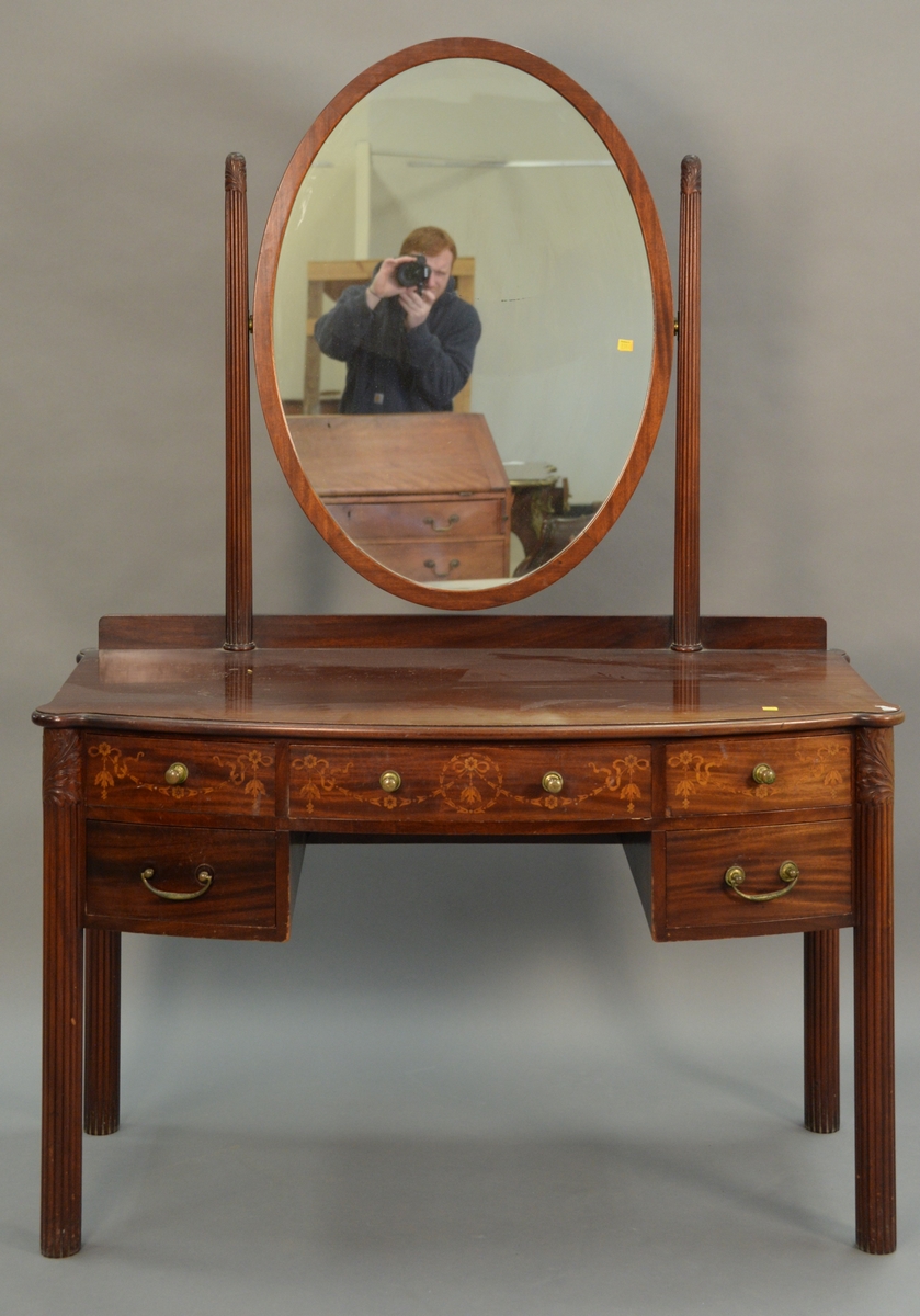 Six art nouveau pieces including two heavy brass art nouveau letter opensrs, art nouveau vase, vanity mirror with dancing woman, brass small tray, and a silverplated standing figure. mirror: ht. 11 1/4in., wd. 10in.