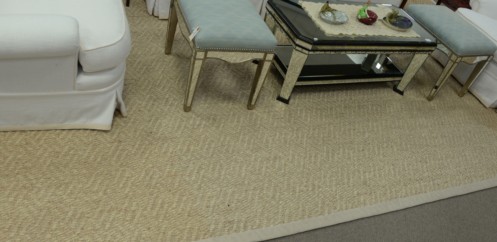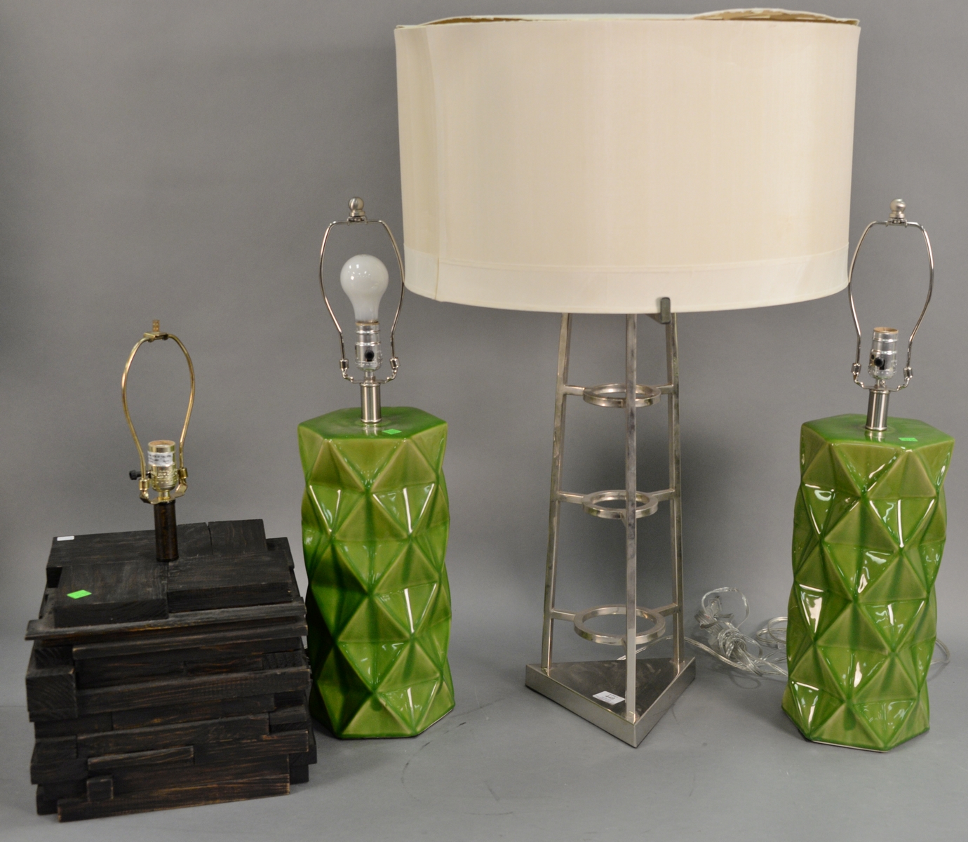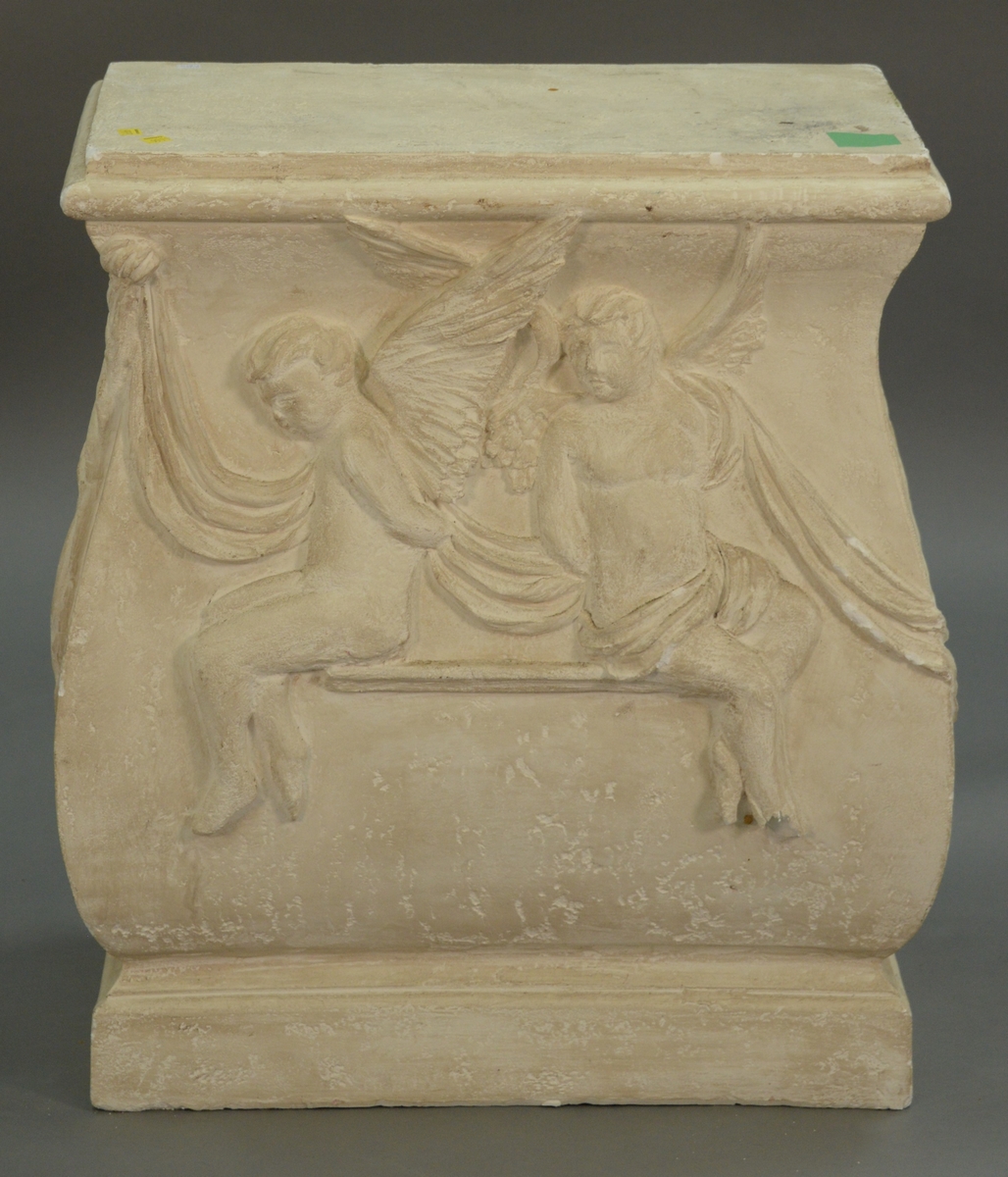 Six art nouveau pieces including two heavy brass art nouveau letter opensrs, art nouveau vase, vanity mirror with dancing woman, brass small tray, and a silverplated standing figure. mirror: ht. 11 1/4in., wd. 10in.