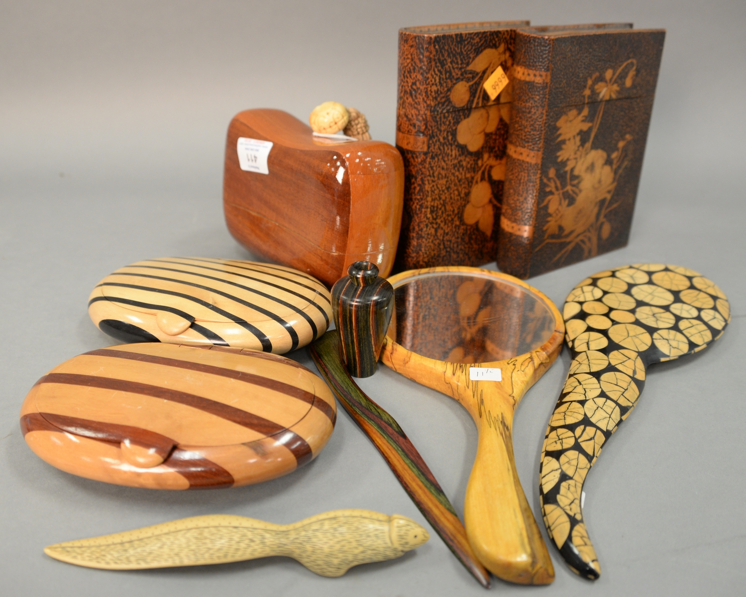 Group lot with two Pyrography faux leather book boxes ht. 7 1/2in., wd. 5 1/2in. and a group of eight carved and inlaid wood items to include Asian clutch purse,possibly Timmy Wood or Christian Graciel, two inlaid boxes, two hand mirrors, two letter openers, and a small vase. purse: lg. 7in., ht. 5in.