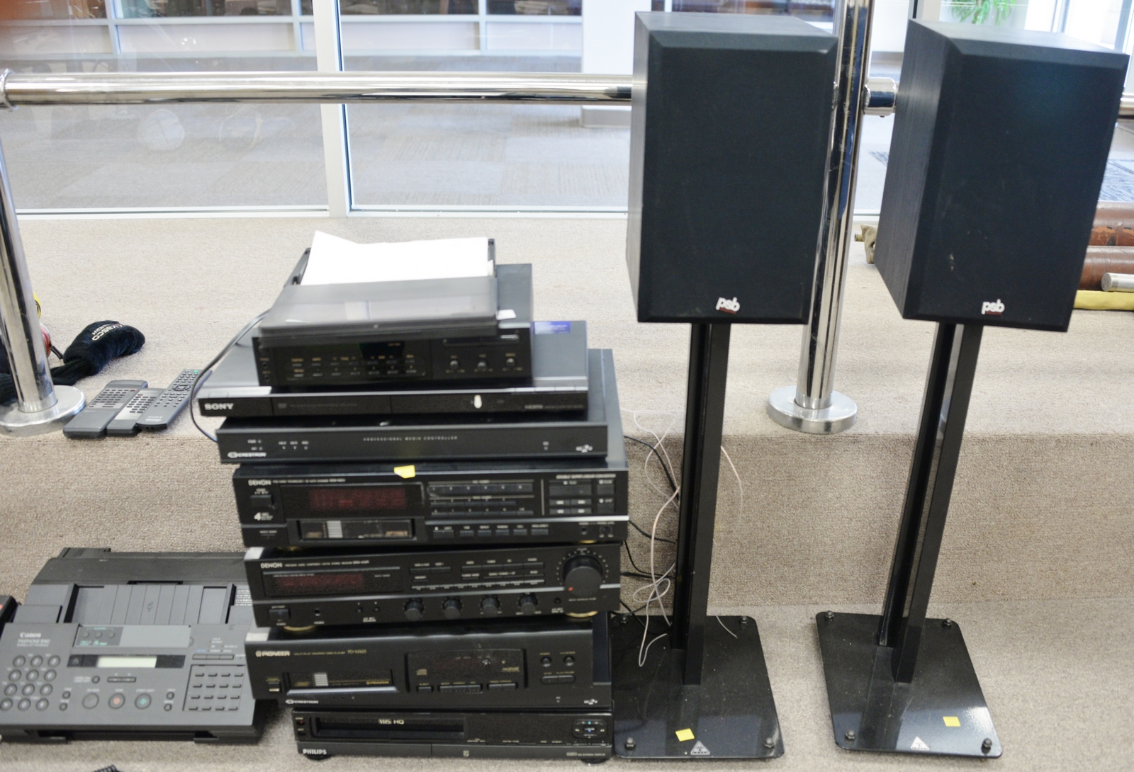 Group of electronics to include Sony DVD, two Crestron Media controllers, two Denon CD auto changers, Pioneer CD, Nakamichi receiver, and Canon fax machine.