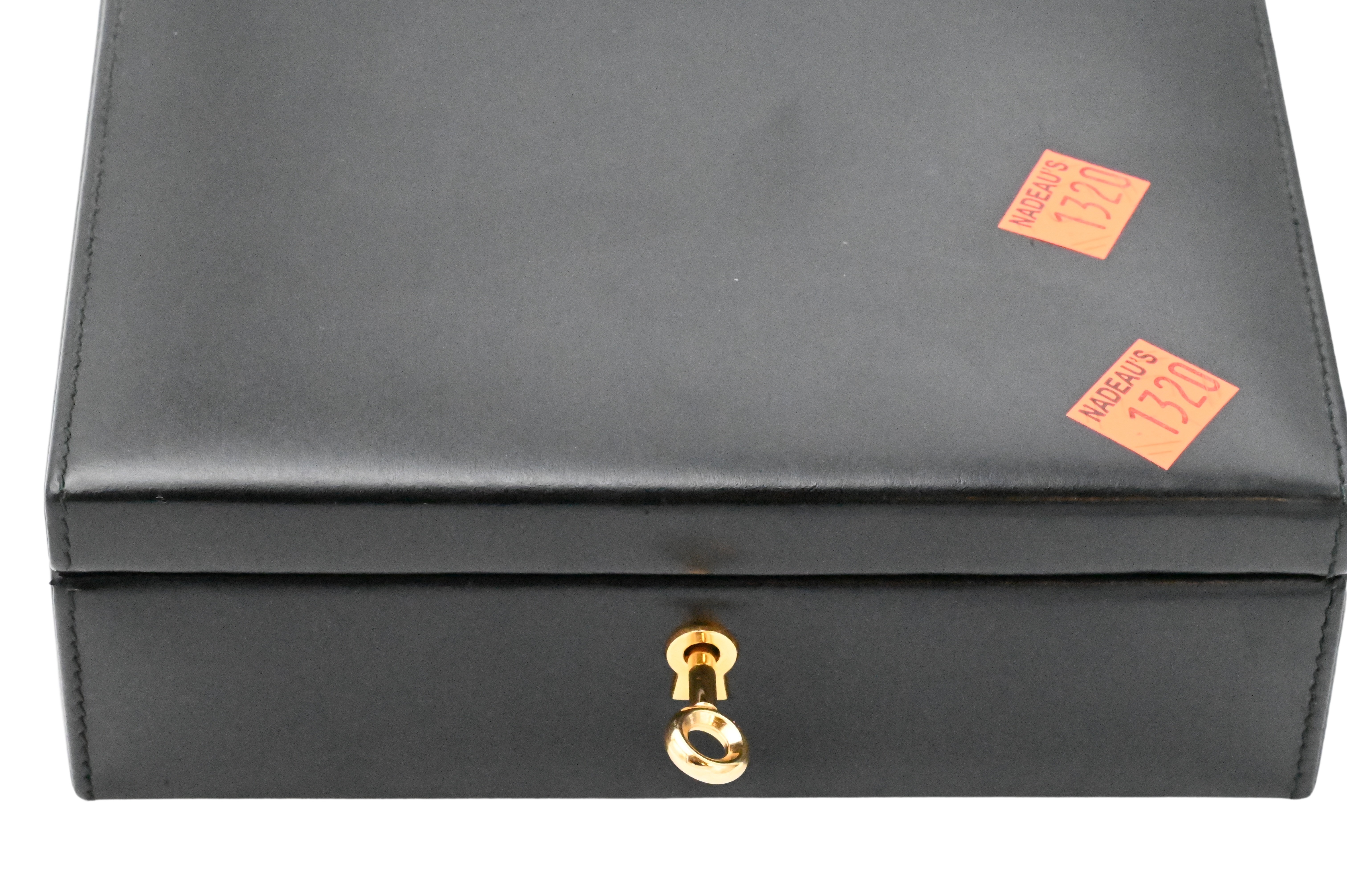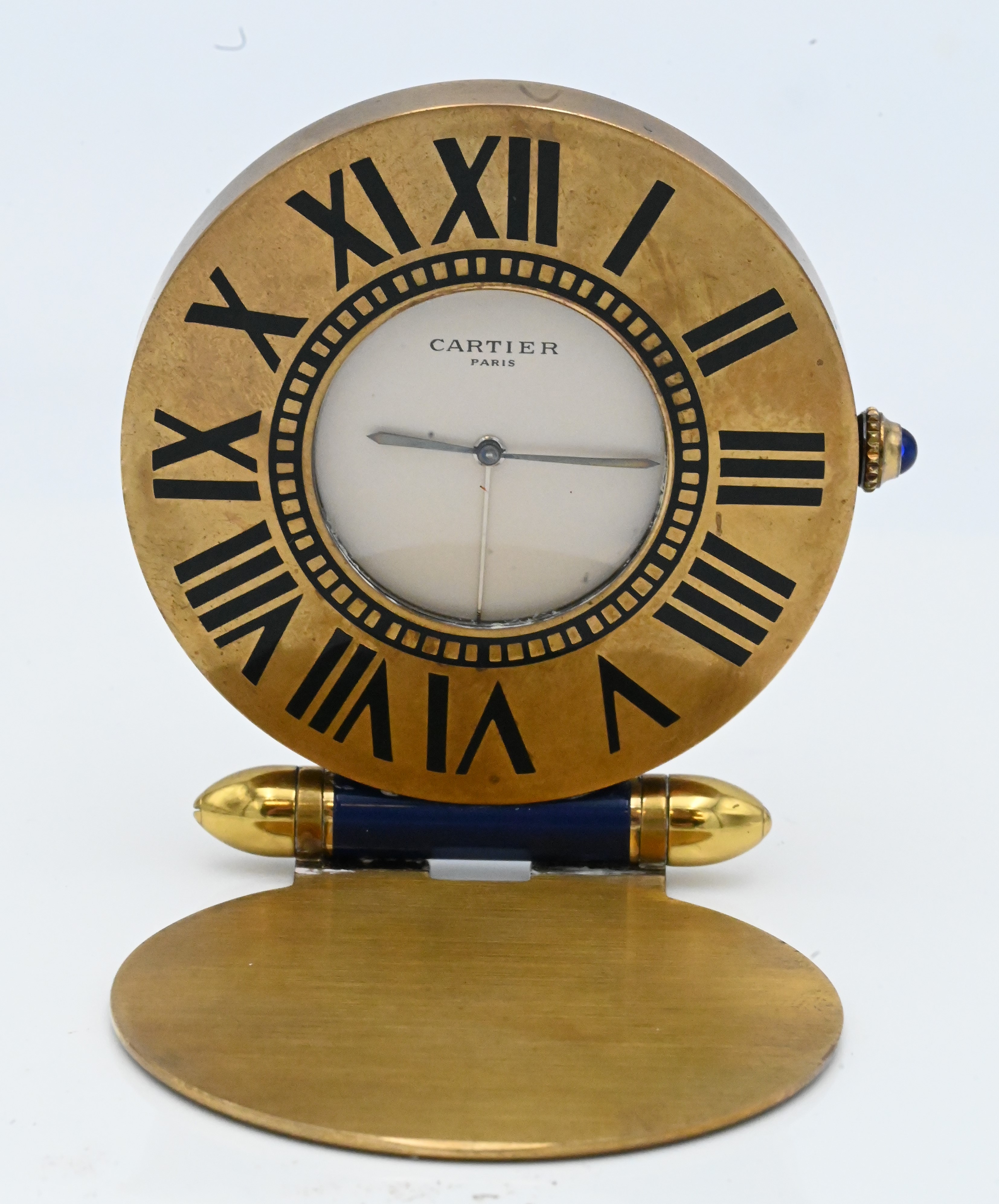 Cartier Gilt Metal and Enameled Travel Clock, having Roman numerals, marked Cartier Paris, Quartz, made in France, numbered 357103879, diameter 2 1/8 inches.