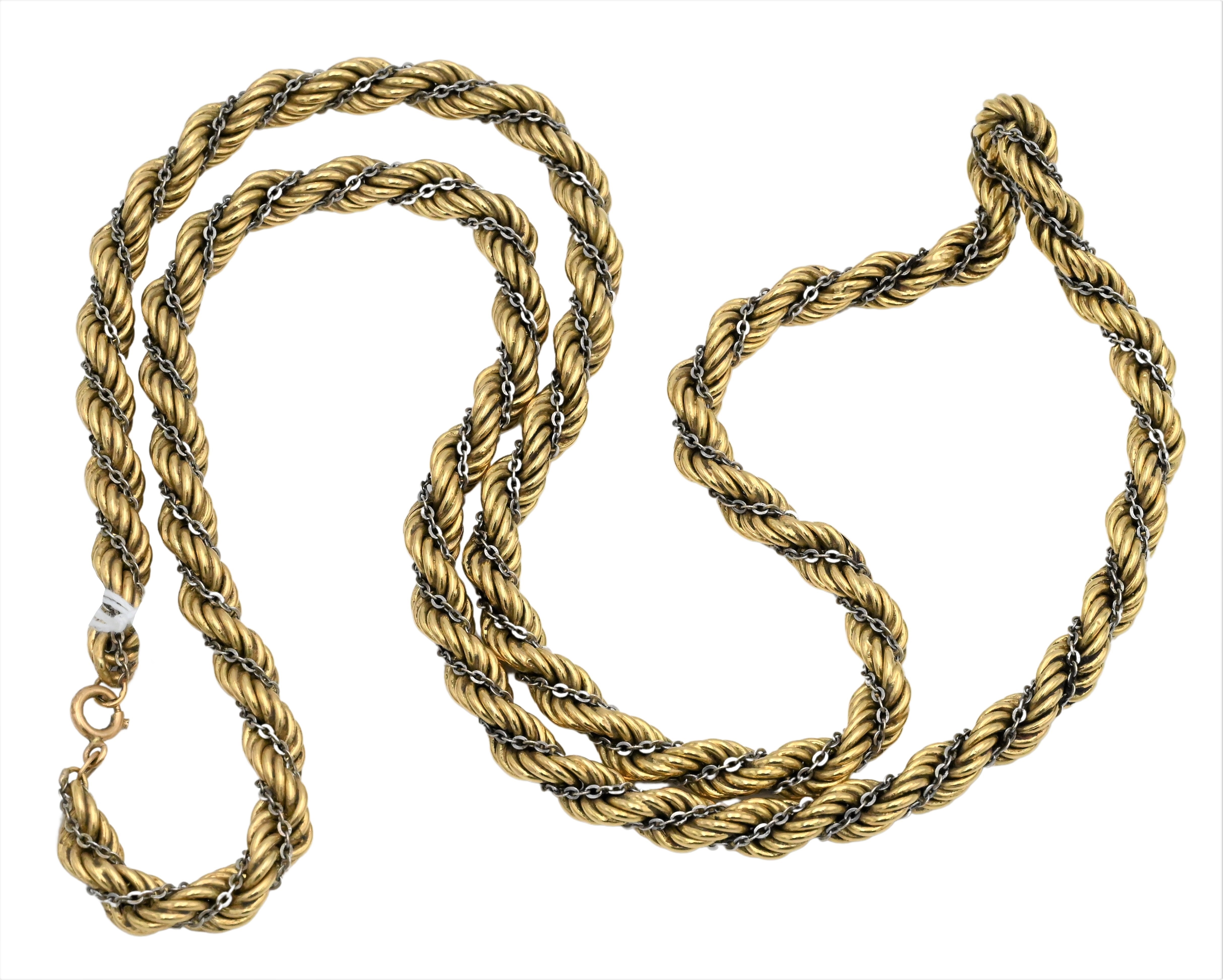 18 Karat Yellow and White Gold Rope Style Necklace, having yellow gold rope wound with small white gold chain, 80.5 grams.