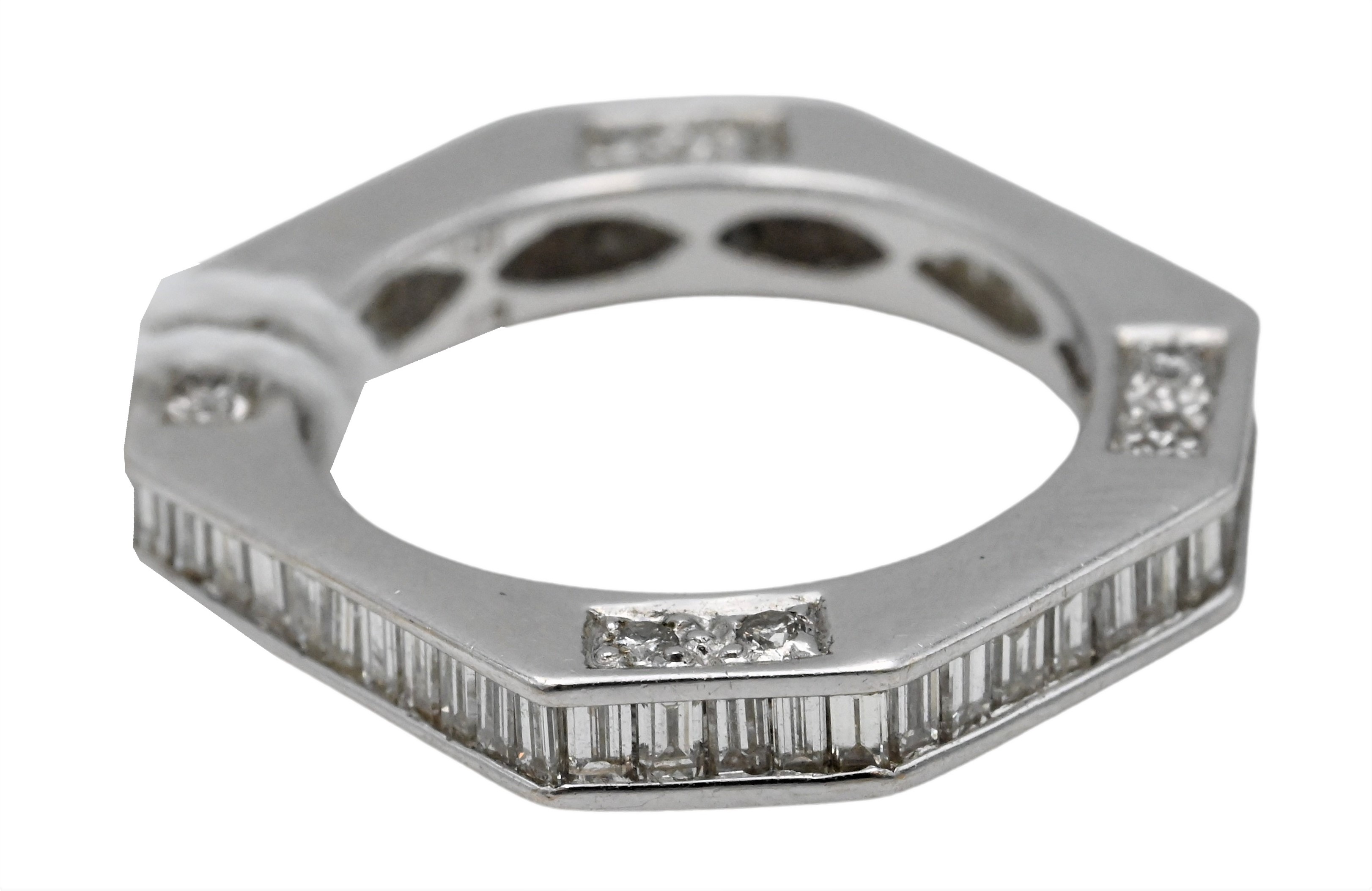 18 Karat White Gold Ring, eight sided channel set with baguette diamonds size 6 1/2 inches, totaling 2.1 carats, 5 grams.