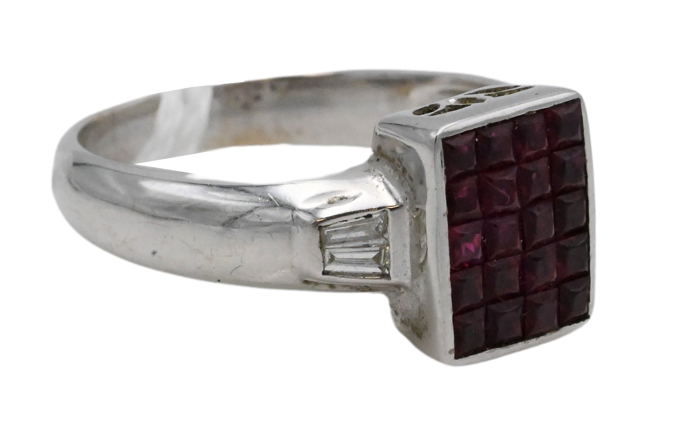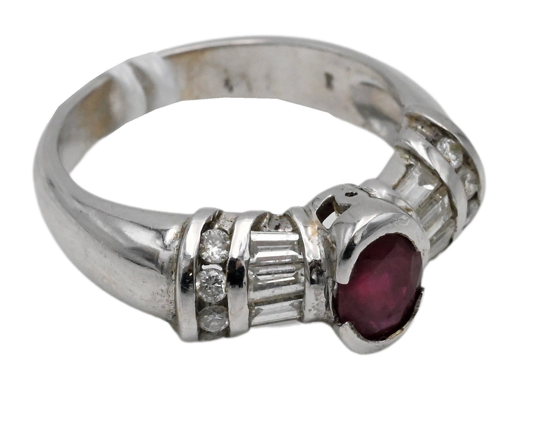 18 Karat White Gold Ring, set with center oval red stone, flanked by baguette and round diamonds, size 6 1/2, 6 grams.