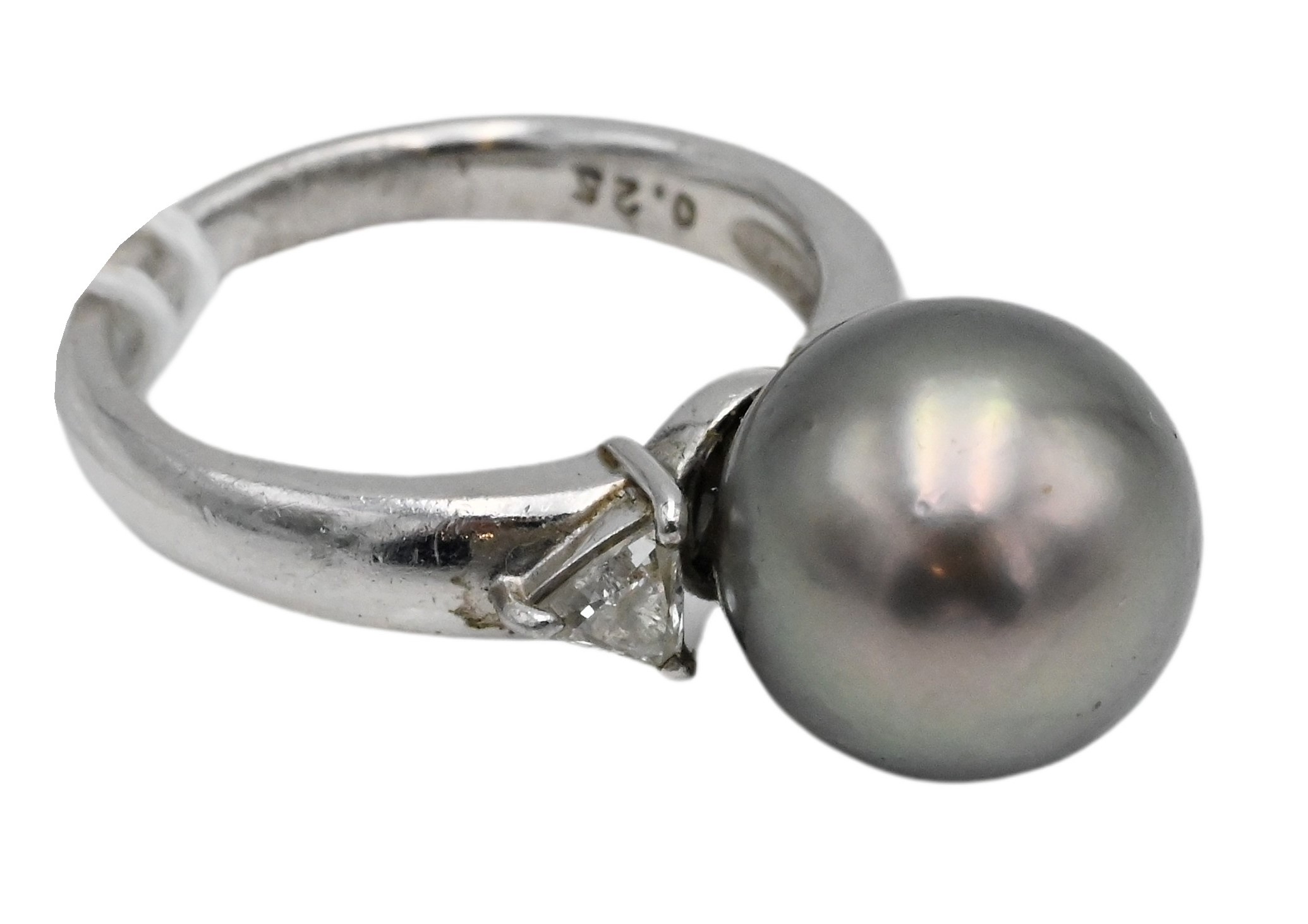 Platinum Ladies Ring, set with center grey pearl, flanked by trillion cut diamonds, size 5 3/4, 8.8 grams.