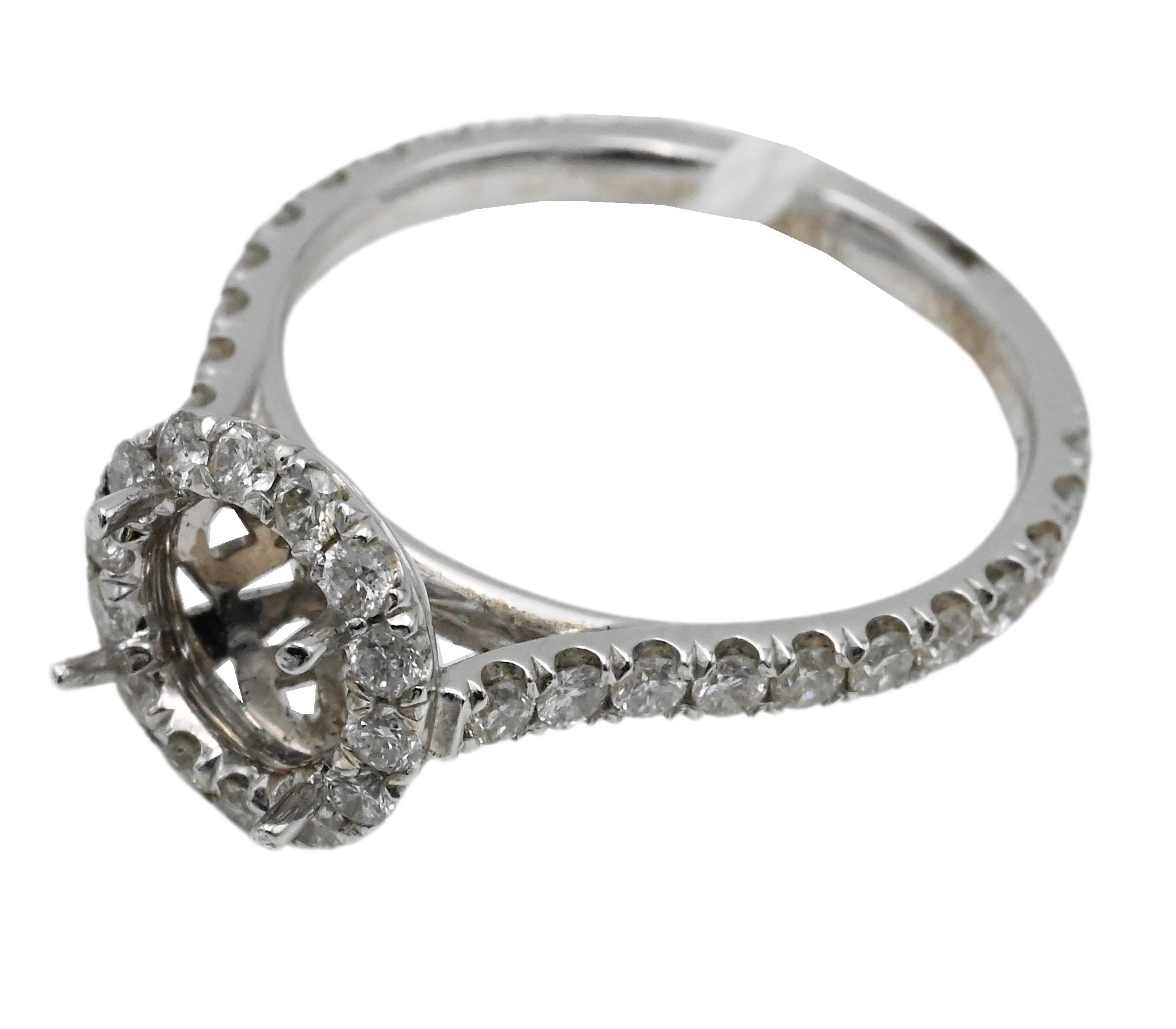 18 Karat White Gold Engagement Ring Setting Only, center with diamond surround and diamonds mounted in the band, size 6, .82 total weight.