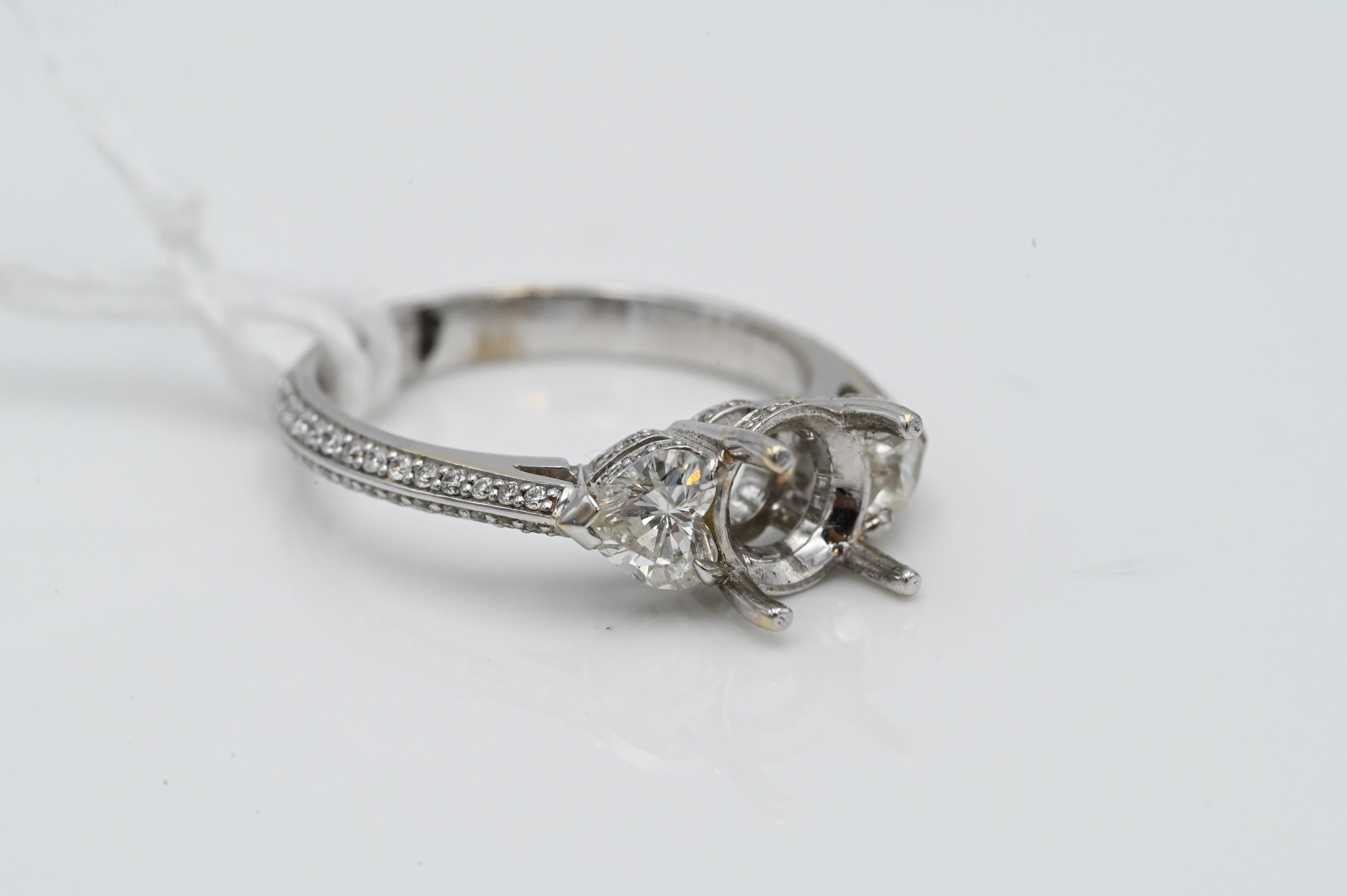 18 Karat White Gold Engagement Ring Setting Only, flanked by heart shaped diamonds, with small diamonds, 3/4 around ring, size 6 1/4, total weight 1.15 karat, 4 grams.