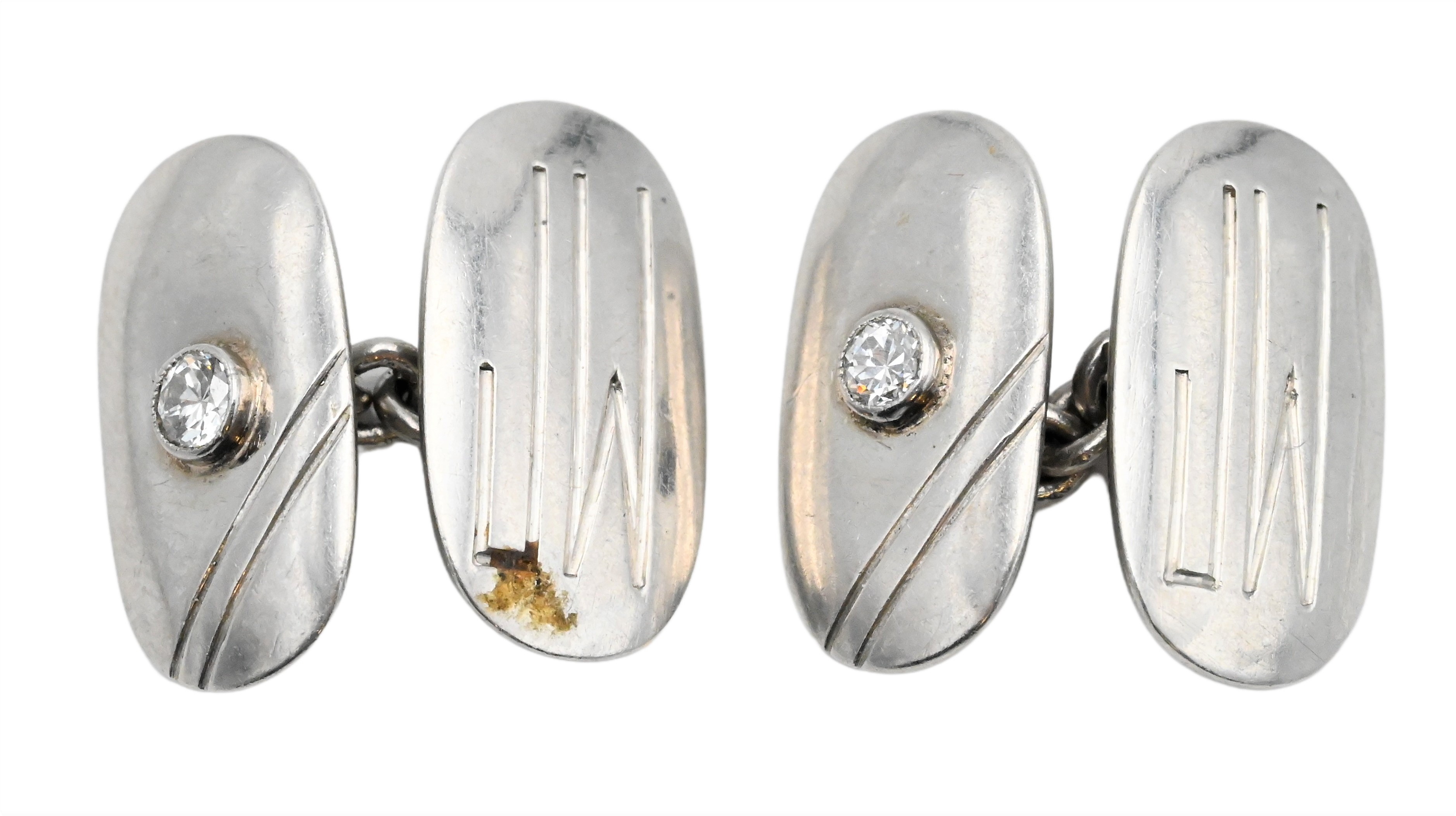 14 Karat White Gold Cufflinks, set with one small diamond each, monogrammed JW, 6.5 grams.