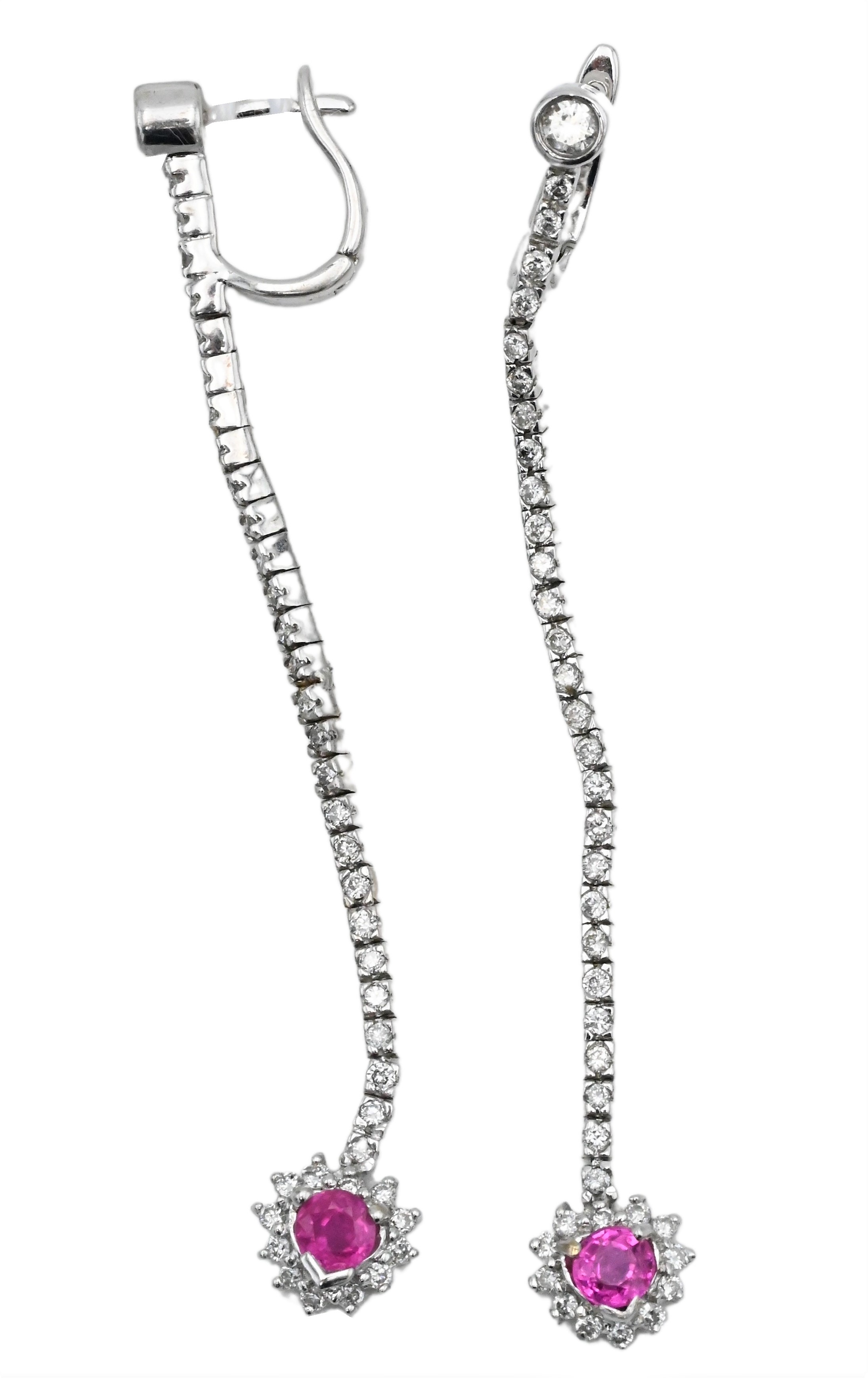 18 Karat White Gold Pierced Earrings, having hanging small diamonds, round red stone at end, length 2 1/4 inches.