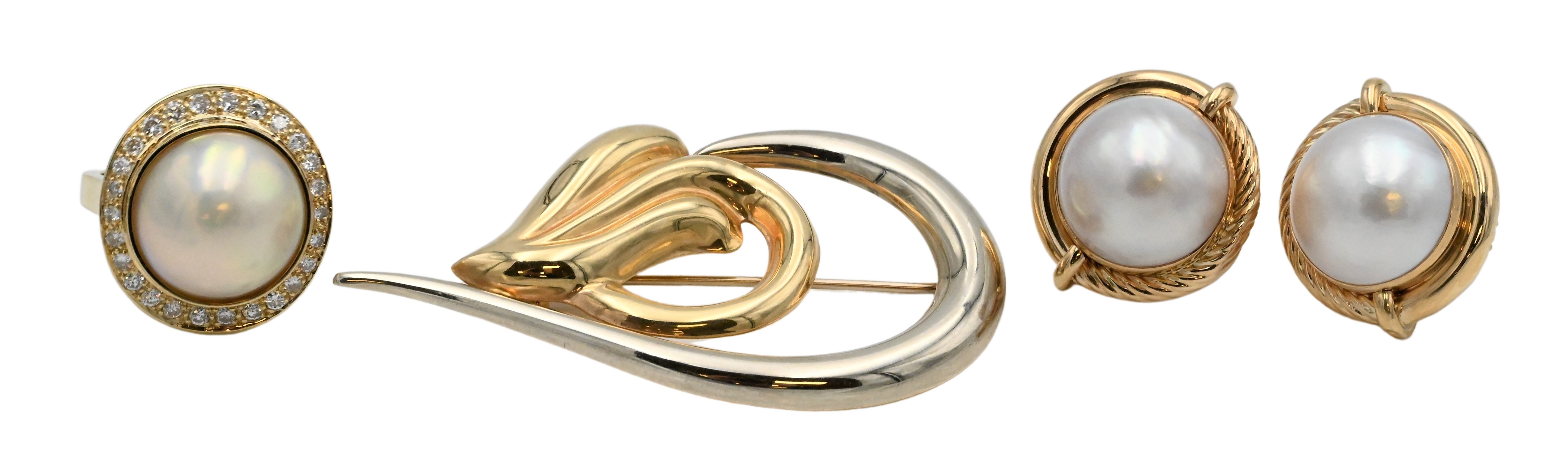 Three Piece Lot, to include pair 14 karat yellow gold earrings, set with pearls, along with a 14 karat yellow gold cocktail ring, set with pearls surrounded by diamonds, size 7 3/4 inches, 21.7 grams total weight.