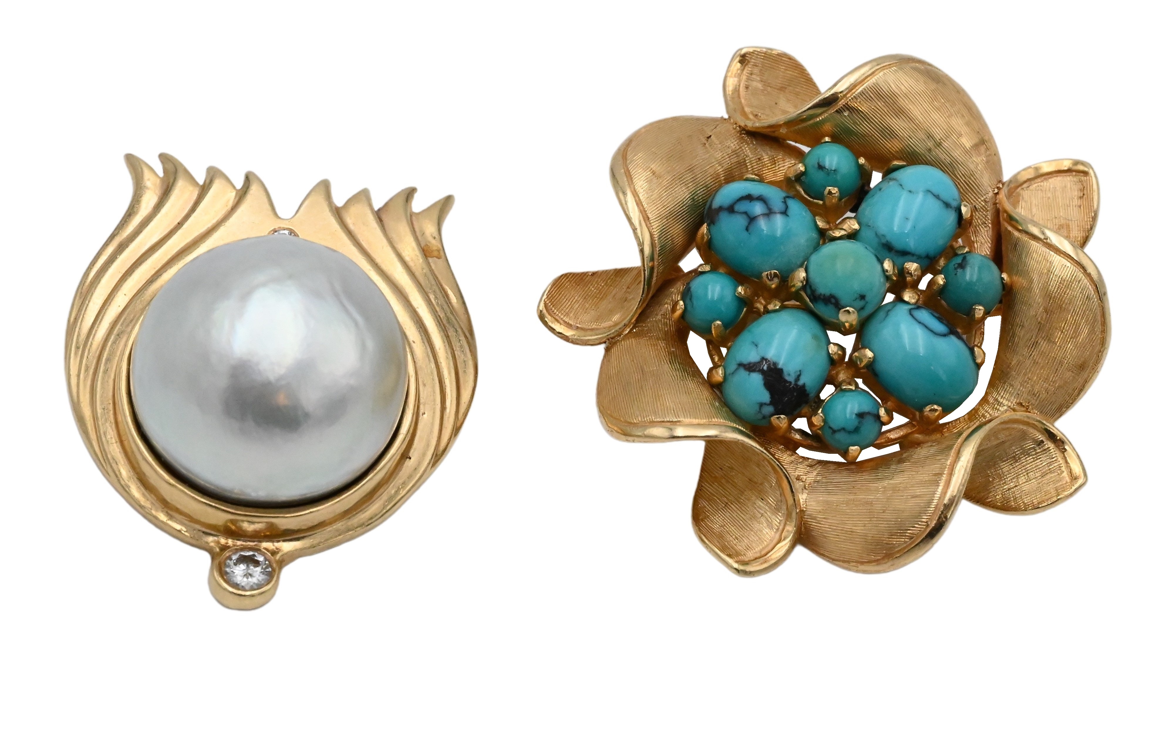 Three Piece 14 Karat Yellow Gold Lot, to include two brooches, along with pearl pendant, one brooch marked Bassini, total weight 37.3 grams.